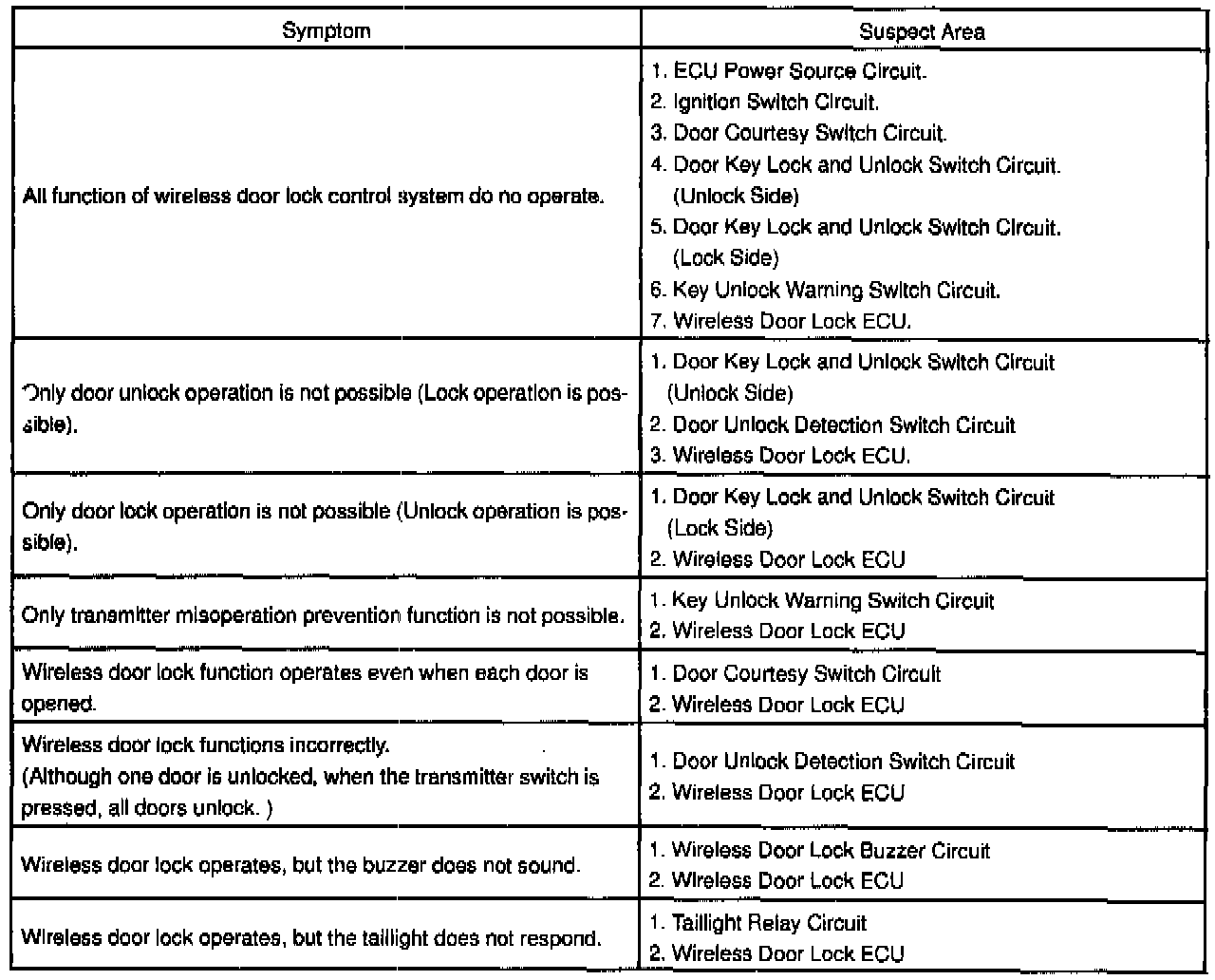 - Troubleshooting of the wireless door lock control system is based on the premise that the door lock control system and theft deterrent system are operating normally. Accordingly, before troubleshooting the wireless door lock control system, first make certain that the door lock control system and theft deterrent system are operating normally.