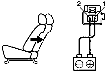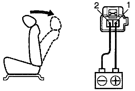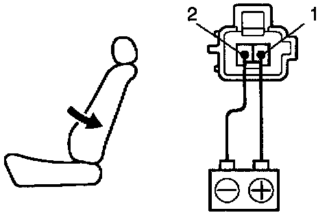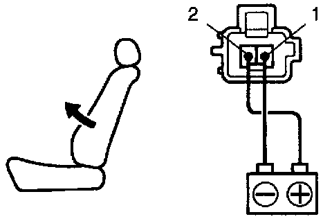 d. Approximately 60 seconds later, connect the positive (+) lead from the battery to terminal 1 and the negative (-) lead to terminal 2, check that the seat back begins to fall backward.