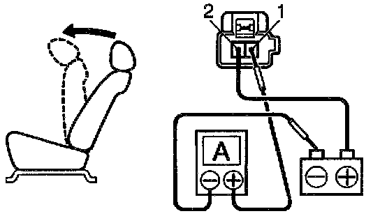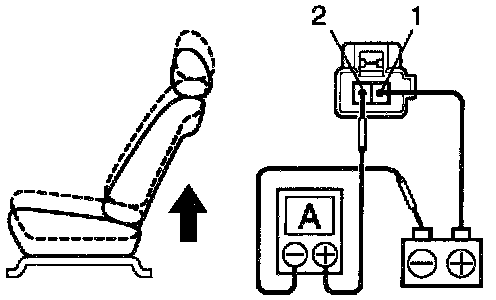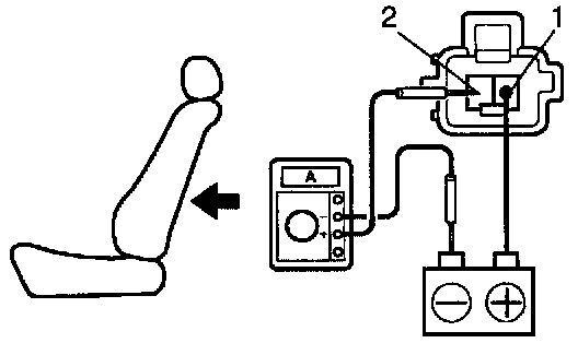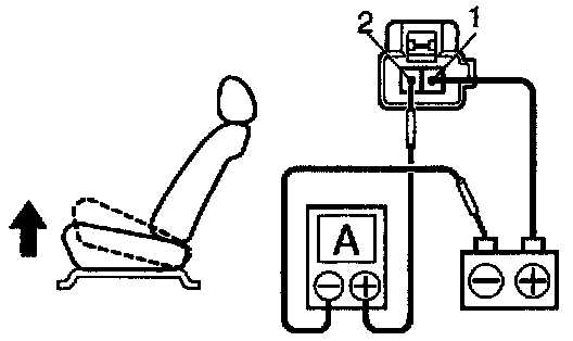 a. Connect the positive (+) lead from the battery to terminal 2, the positive (+) lead from the ammeter to terminal 1 and the negative (-) lead to the battery negative (-) terminal, then recline the seat back to the most forward position.