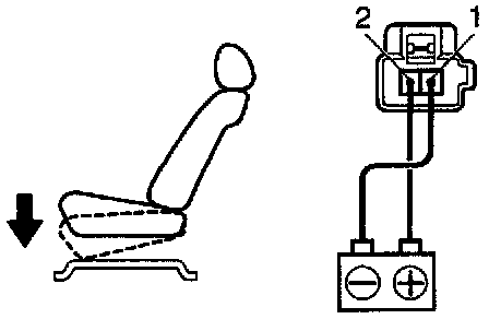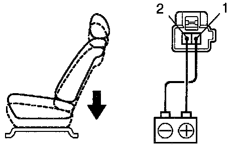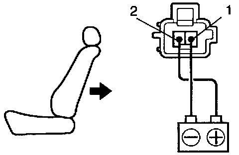 d. Approximately 60 seconds later, connect the positive (+) lead from the battery to terminal 1 (2) and the negative (-) lead to terminal 2 (1), check that the seat cushion begins to move backwards.
