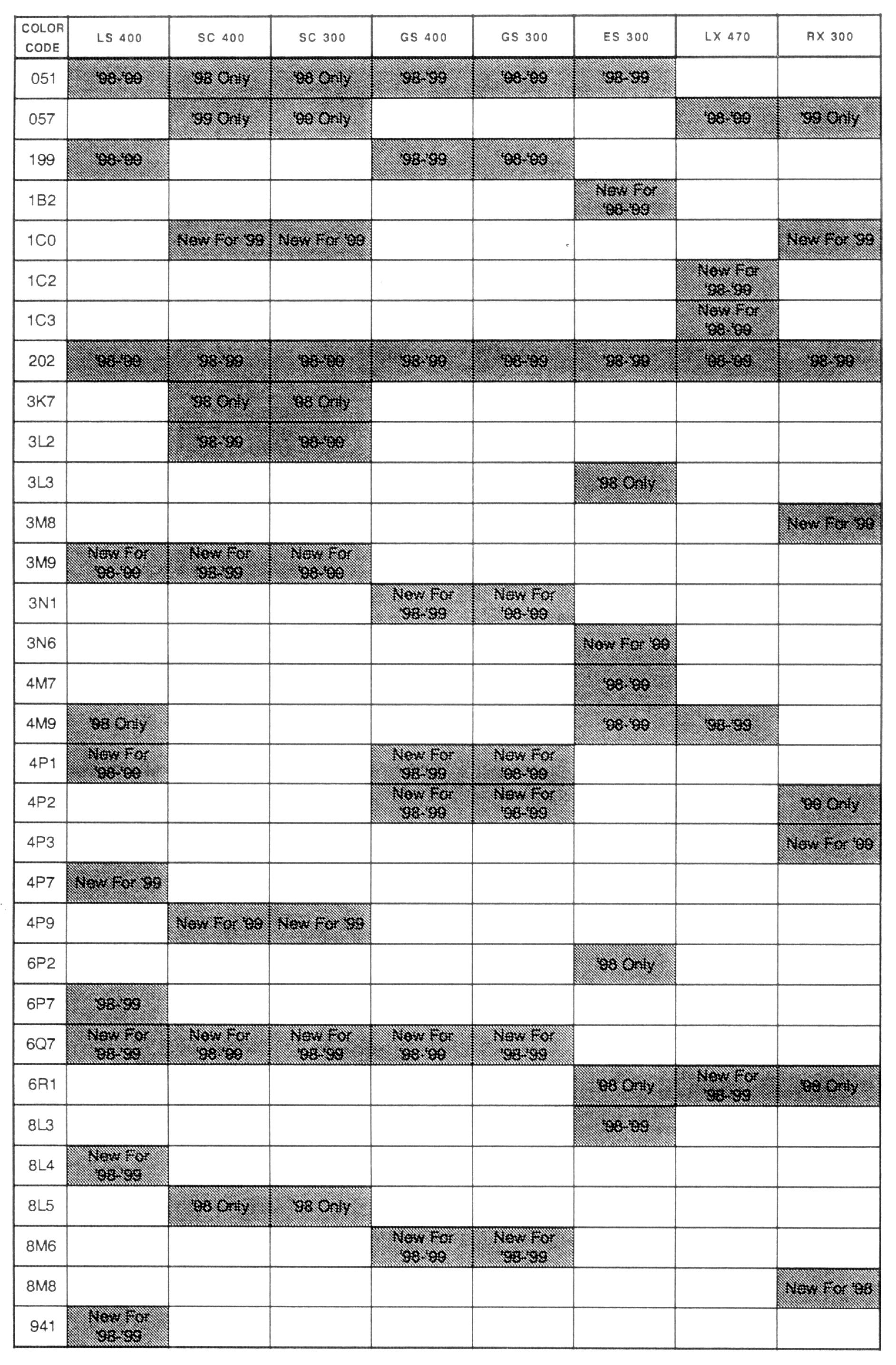 The following is a listing of all 1998 & 1999 Lexus paint codes and corresponding refinish formula codes for 8 (eight) refinish paint companies -- BASF, DuPont, ICI, PPG, Sherwin Williams, Sikkens, Spies Hecker and Standox.