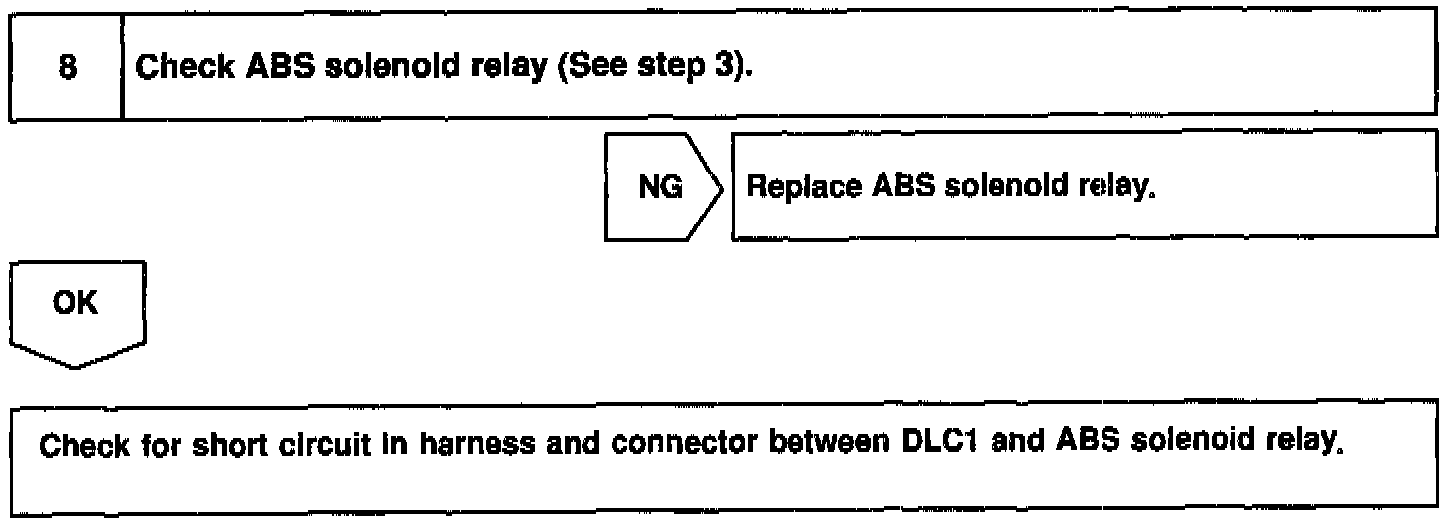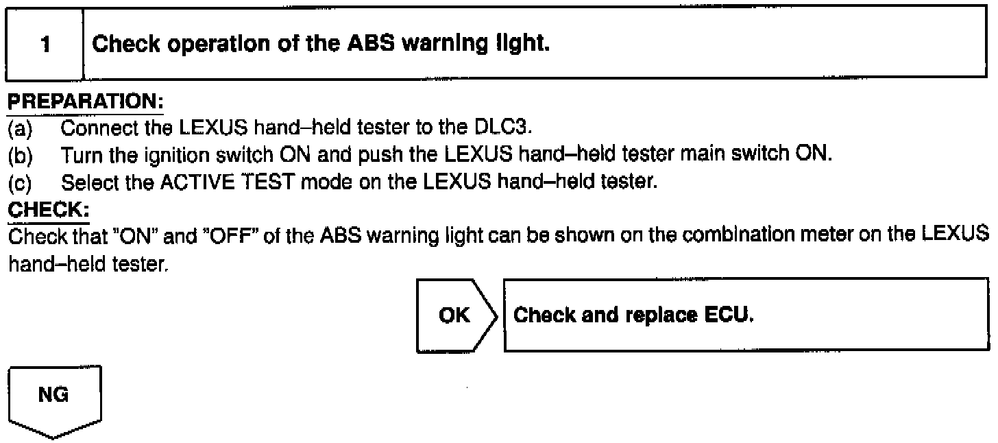 If the ECU detects trouble, it lights the ABS warning light while at the same time prohibiting ABS control. At this time, the ECU records a DTC in memory.