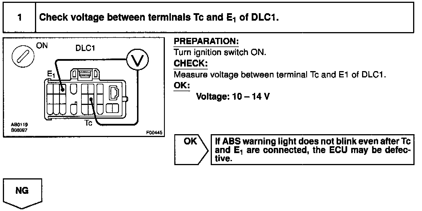 Connecting terminals TC and E1 of the DLC1 causes the ECU to display the DTC by flashing the ABS warning light.