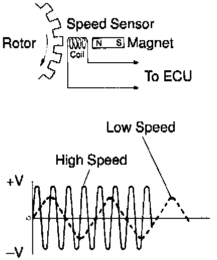 When the rotors rotate, the magnetic field emitted by the permanent magnet in the speed sensor generates an AC voltage. Since the frequency of this AC voltage changes in direct proportion to the speed of the rotor, the frequency is used by the ECU to detect the speed of each wheel.