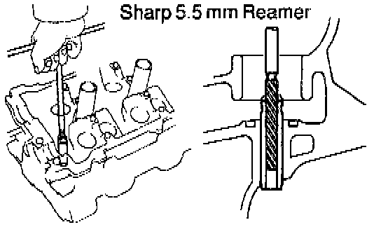 g. Using a sharp 5.5 mm reamer, ream the guide bushing to obtain the standard specified clearance between the guide bushing and valve stem.