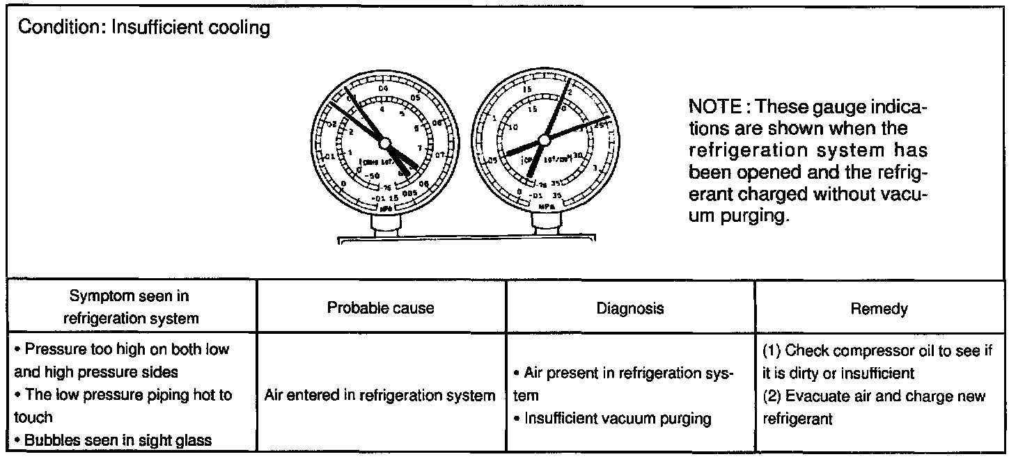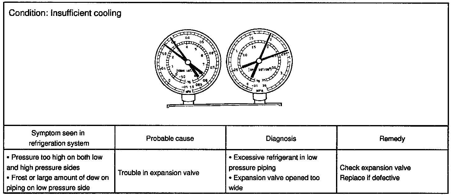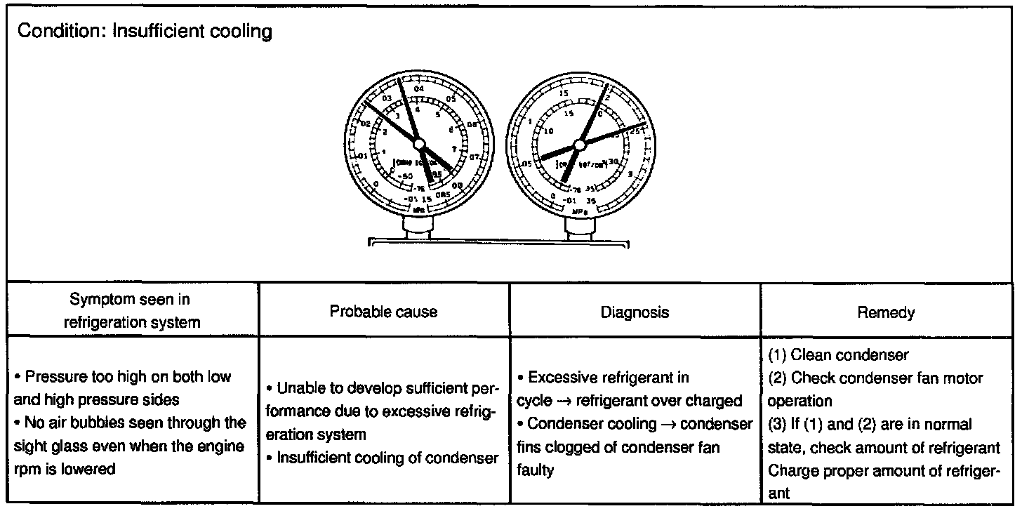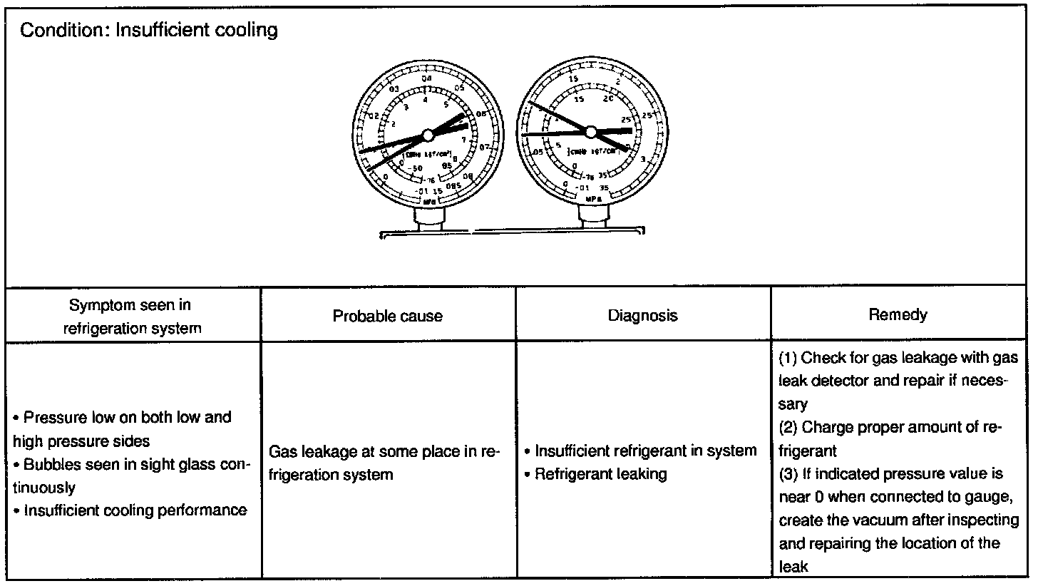 This is a method in which the trouble is located by using a manifold gauge set. Read the manifold gauge pressure when these conditions are established.