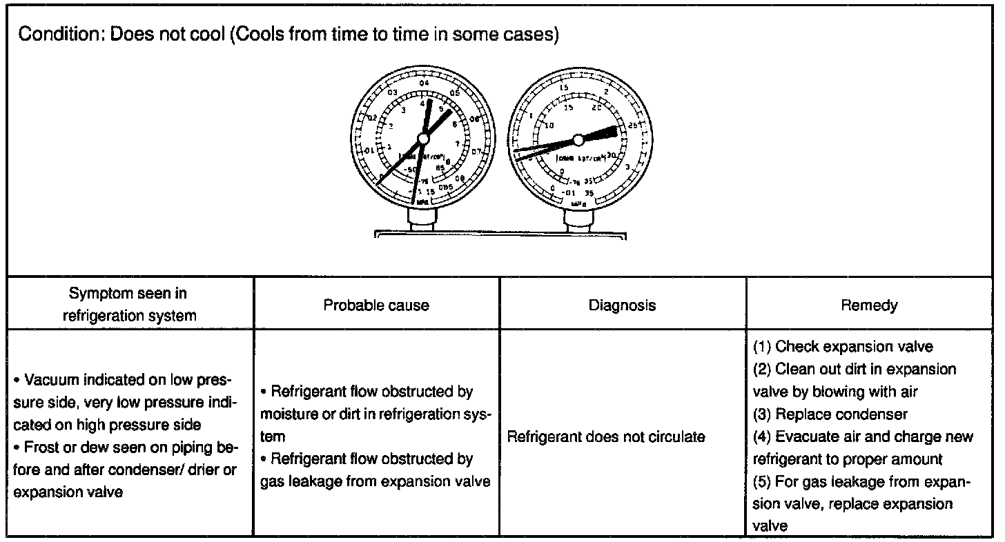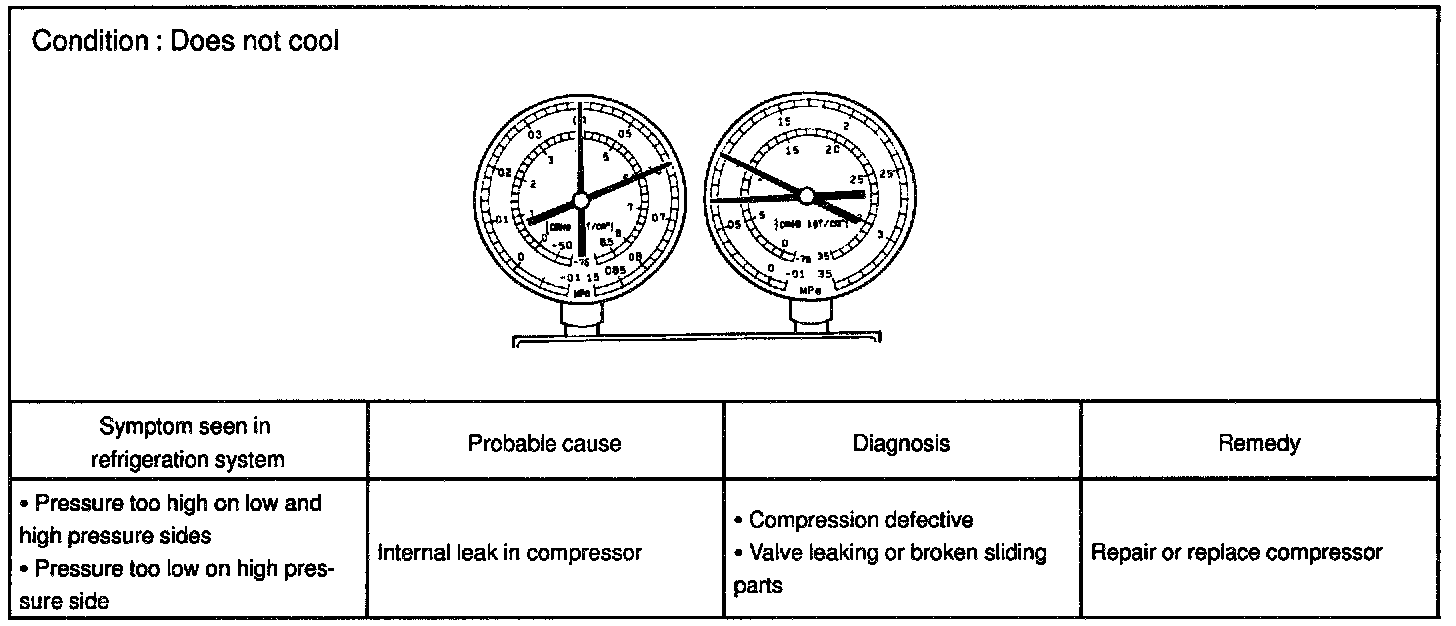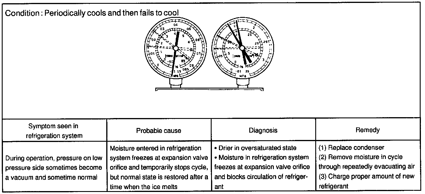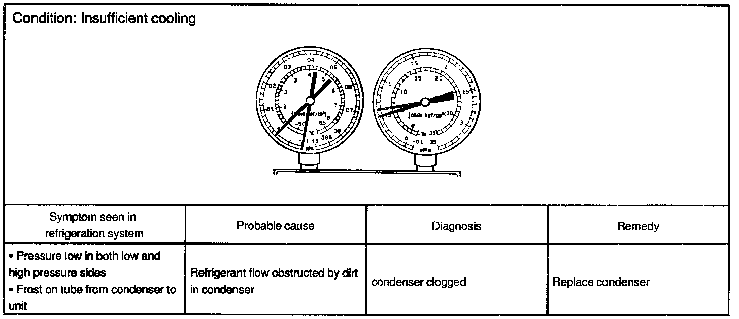 This is a method in which the trouble is located by using a manifold gauge set. Read the manifold gauge pressure when these conditions are established.