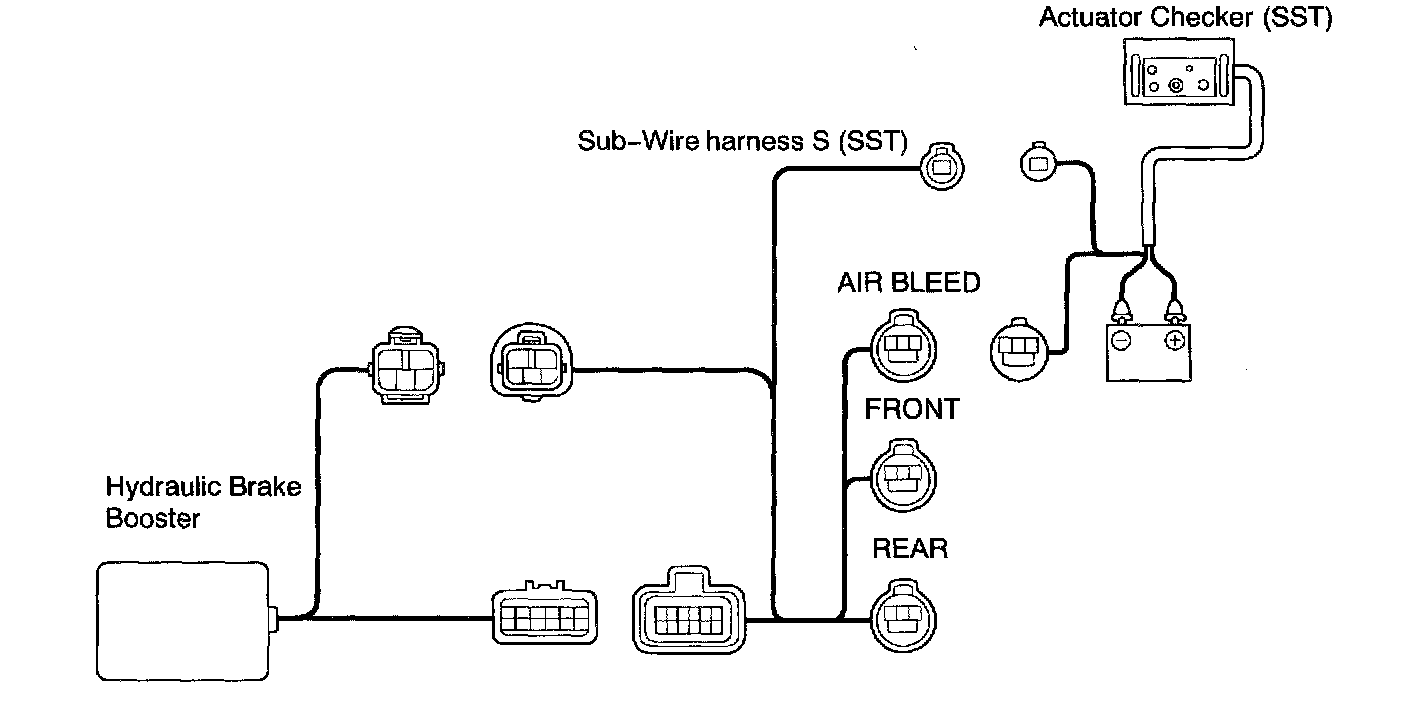 b. Connect the actuator checker (SST) to the hydraulic brake booster side wire harness via the sub-wire harness (SST), as shown in the chart.