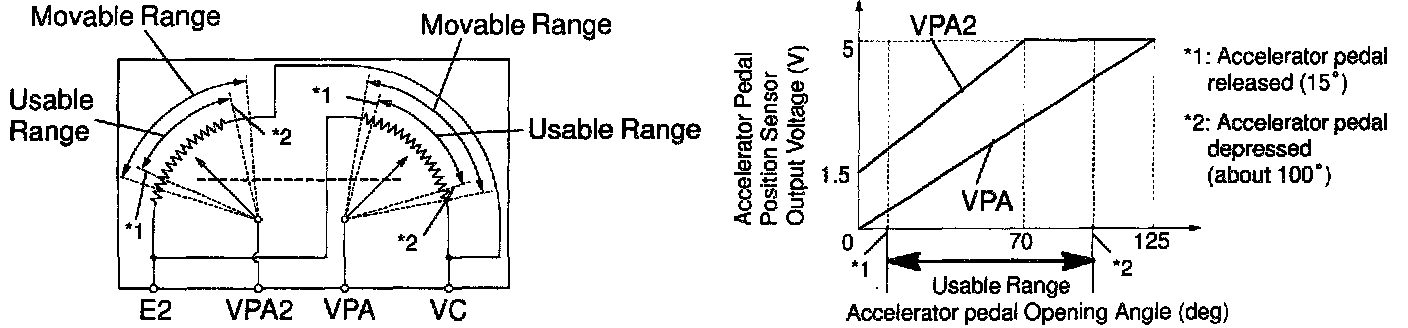 The accelerator pedal position sensor is connected with the accelerator pedal by the accelerator wire and the voltage applied to the terminals VPA and VPA2 of the ECM changes between 0 V and 5 V in proportion to the opening angle of the accelerator pedal.