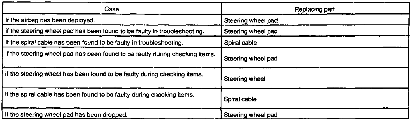 REPLACEMENT REQUIREMENTSIn the following cases, replace the steering wheel pad, steering wheel or spiral cable