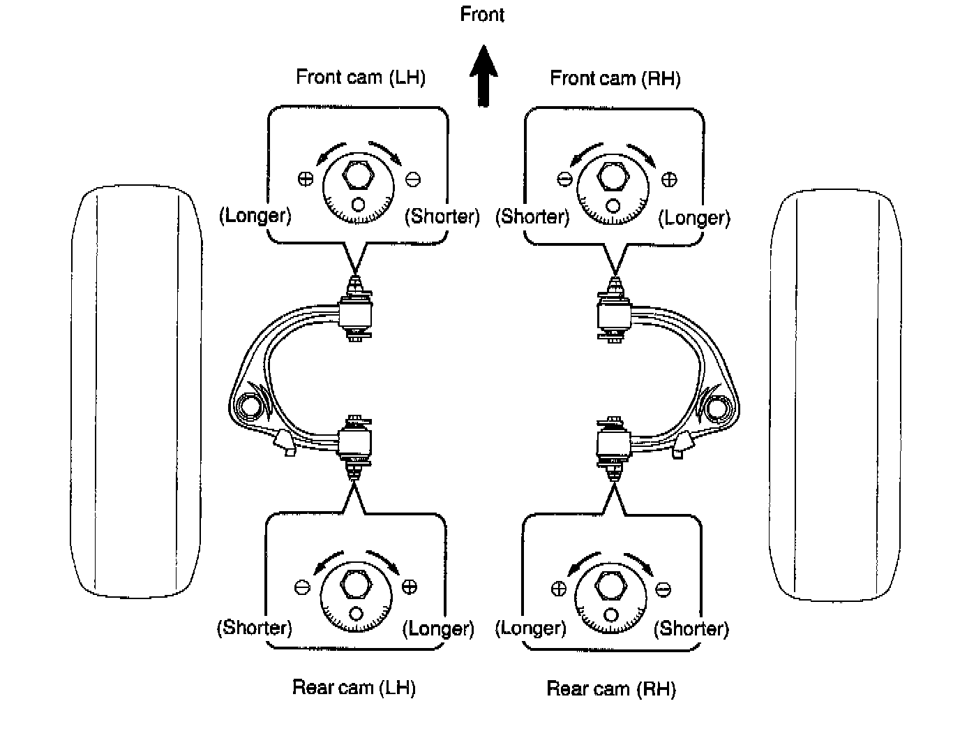 b. Adjust the camber and caster by front and/or rear adjusting cams.