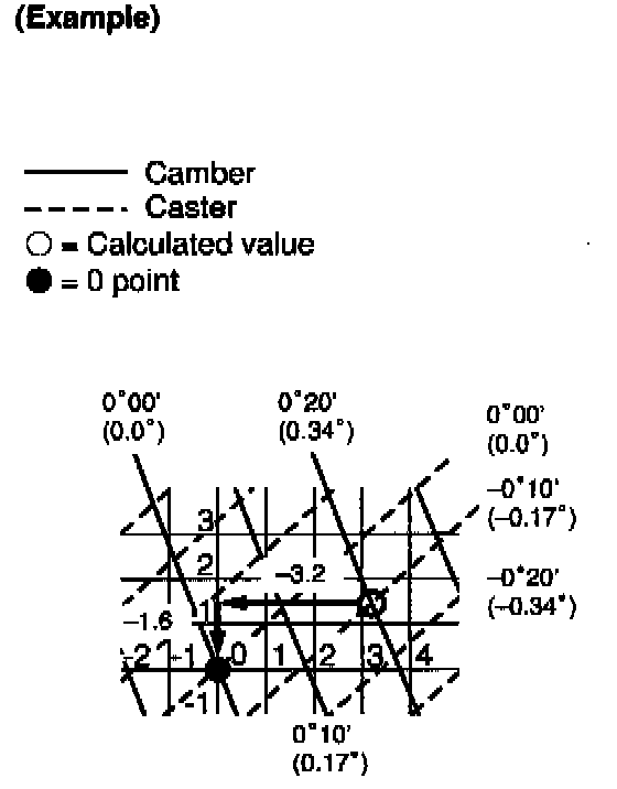 3. As shown in the chart, read the distance from the marked point to O point, and adjust the front and/or rear adjusting cams accordingly.