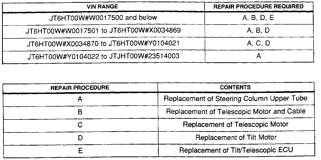 Conduct the repair item(s) shown depending on the VIN of the problem vehicles.