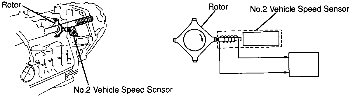 The No. 2 vehicle speed sensor detects the rotation speed of the transmission output shaft and sends signals to the ECM. The ECM determines the vehicle speed based on these signals.