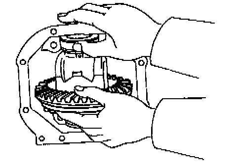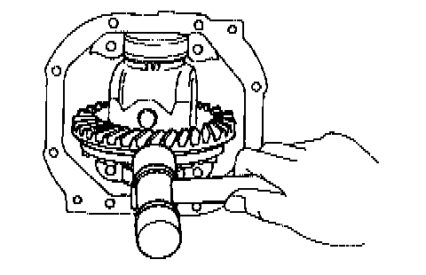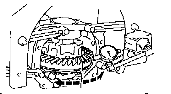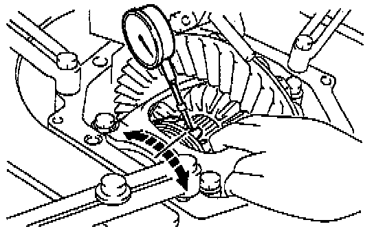 Using a dial indicator, measure the side gear backlash while holding one pinion gear toward the differential case.