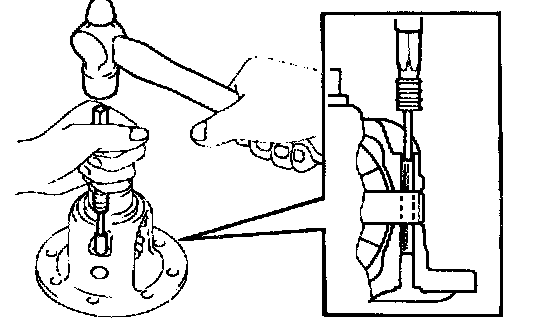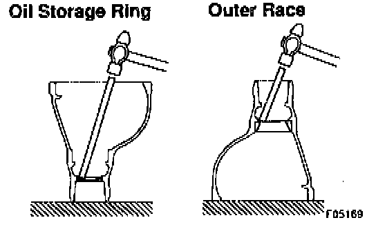 b. Using a brass bar and hammer, remove the oil storage ring and front bearing outer race.