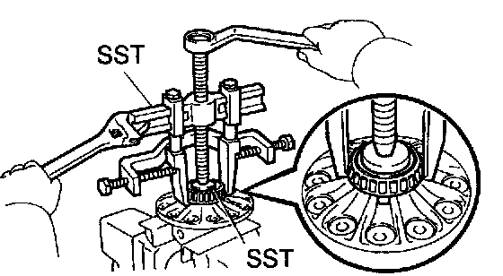 Using SST 09950-40011 (09951-04020, 09952-04010, 09953-04030, 09954-04010, 09955-04060, 09957-04010, 0995004010), 09950-60010 (09951 -00480), remove the 2 side bearings from the differential case.