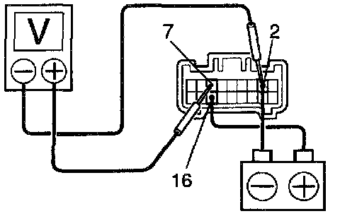 d. Connect the positive (+) lead from the voltmeter to terminal 7 and the negative (-) lead to terminal 2, check that the meter needle indicates battery voltage.