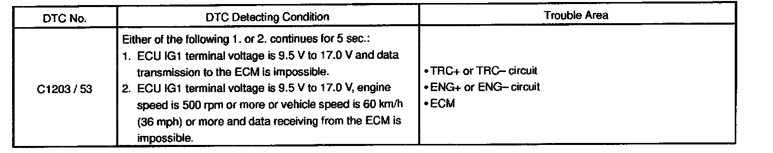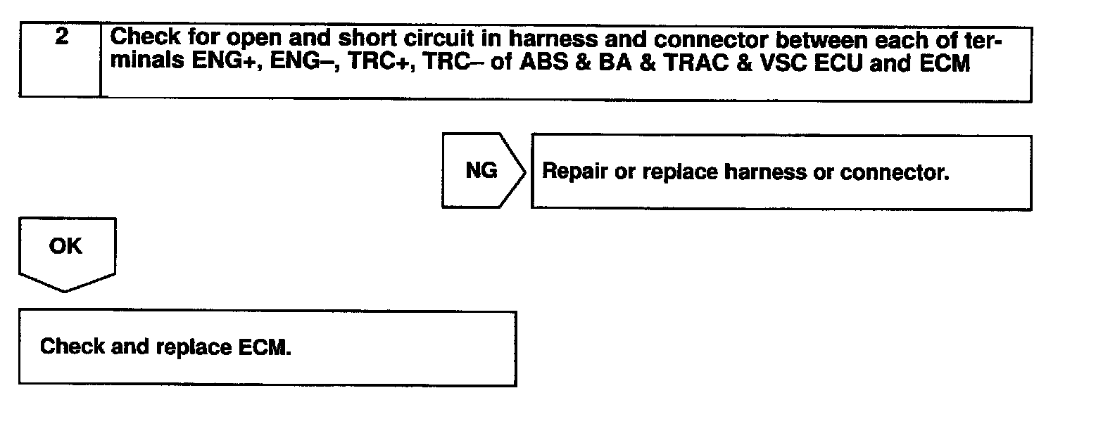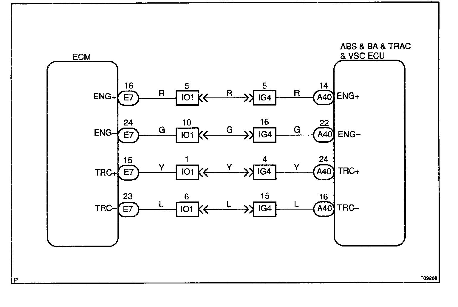 CIRCUIT DESCRIPTIONThe circuit is used to send TRAC & VSC control information from the ABS & BA & TRAC & VSC ECU to the ECM (TRC+, TRC-), and engine control information from the ECM to the ABS & BA & TRAC & VSC ECU (ENG+, ENG-).