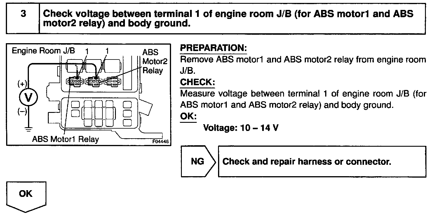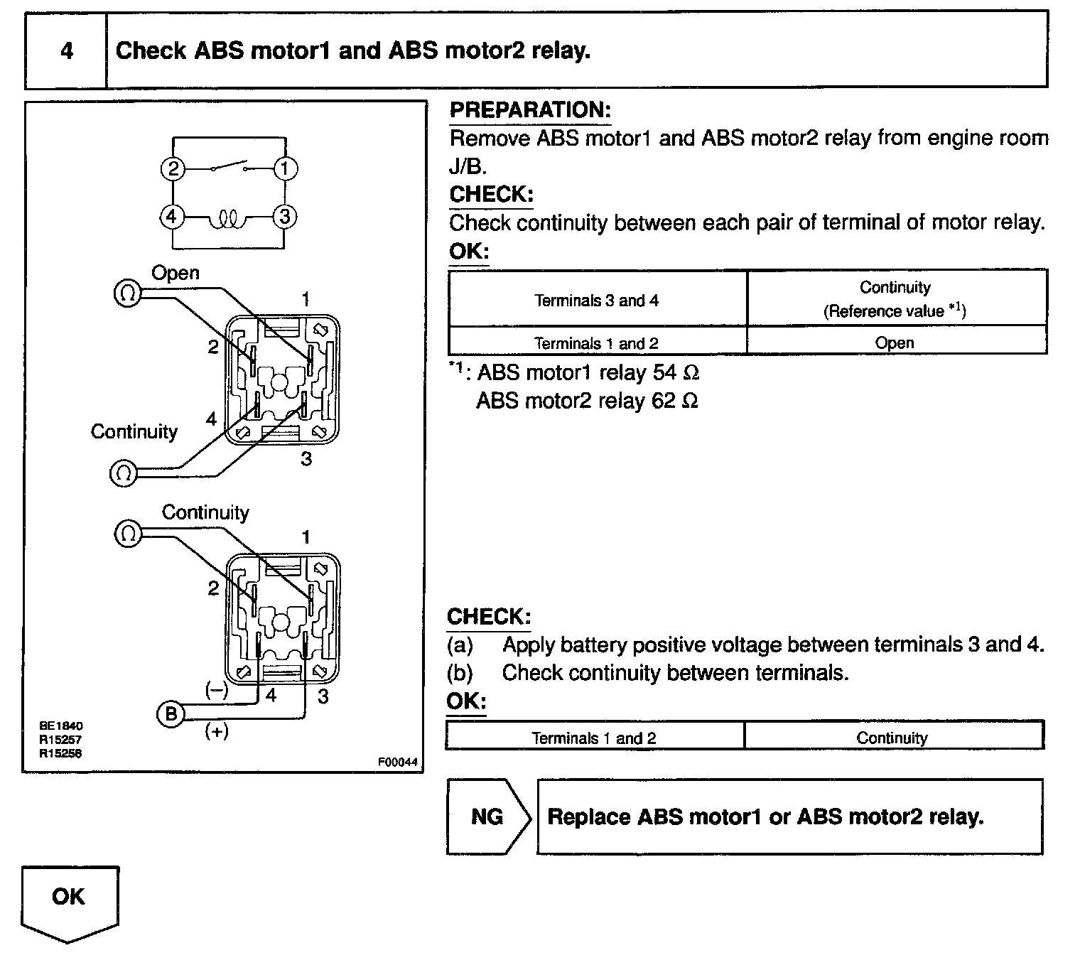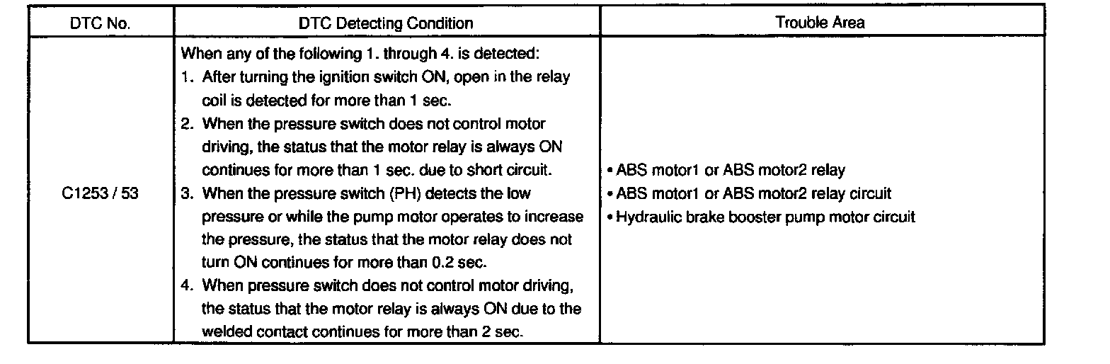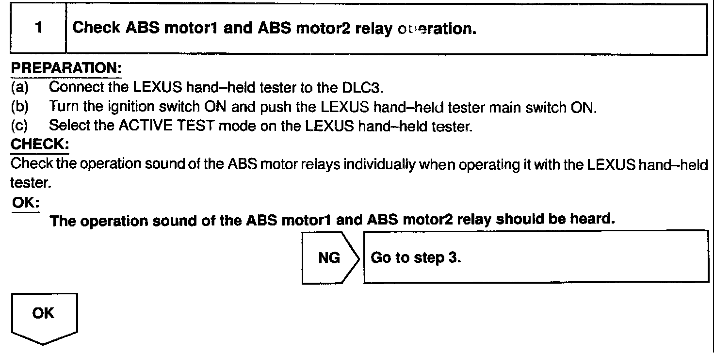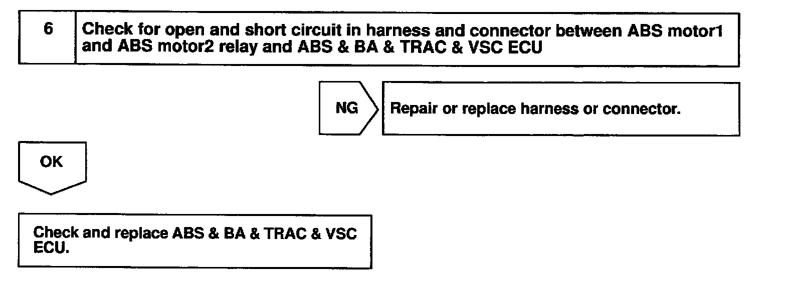If trouble occurs in the ABS motor1 and ABS motor2 relay circuit, the ECU cuts off current to the ABS solenoid relay and prohibits ABS & BA & TRAC & VSC controls.
