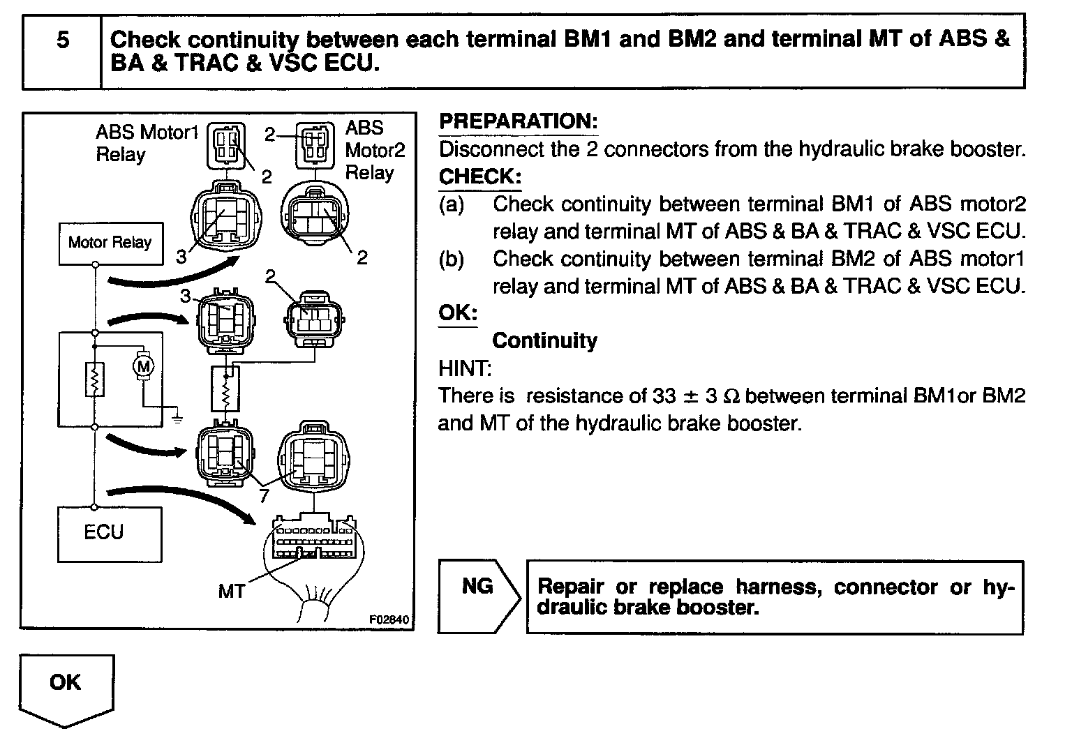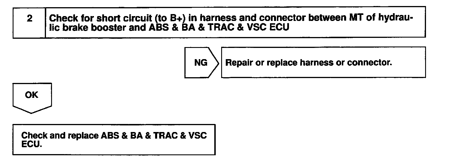 CIRCUIT DESCRIPTIONThe ABS motor1 and ABS motor2 relay supplies power to the hydraulic brake booster pump motor. While the ABS & BA & TRAC & VSC are activated, the ECU switches the motor relay ON and operates the hydraulic brake booster pump motor.