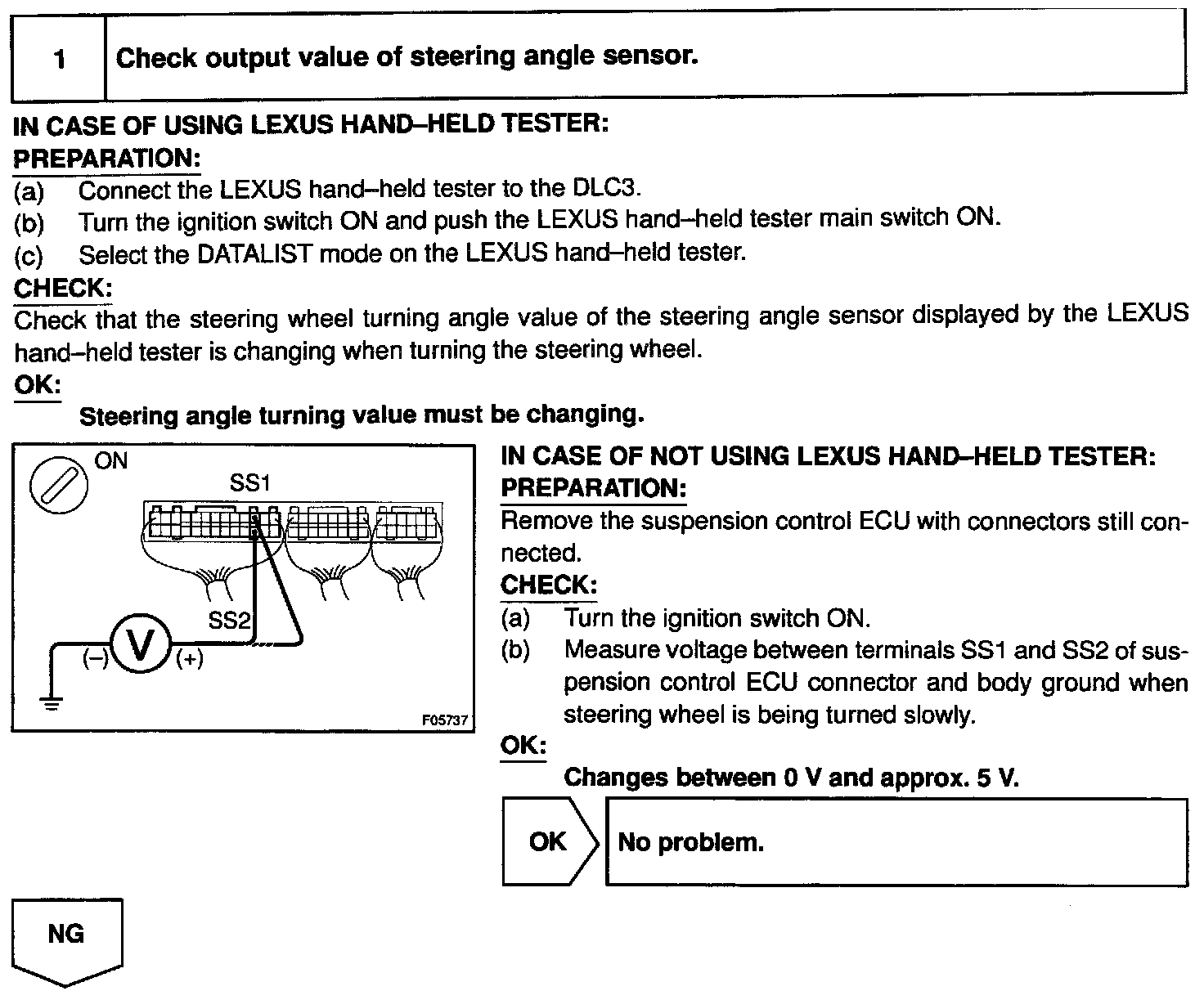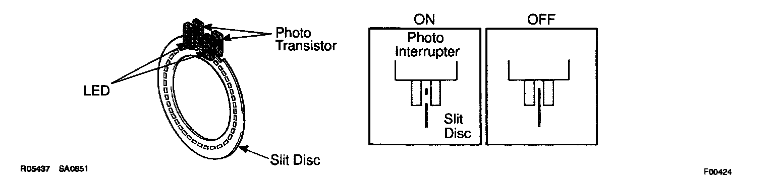 The sensor consists of a slit disc that rotates with the steering wheel as a unit, and a pair of photo interrupters. Each photo interrupter consists of an LED (Light Emitting Diode) and a photo transistor, located facing each other. It converts the change in the light irradiation between the two elements to the on/off signals. The slit disc rotates between the LED and the photo transistor of the pair of photo interrupters. As the steering wheel is operated, the slit disc rotates with the wheel as a until and shuts and makes the light transmission between the 2 elements. The pair of photo interrupters have phases and the suspension ECU detects the steering direction and angle based on the changes of the each output.
