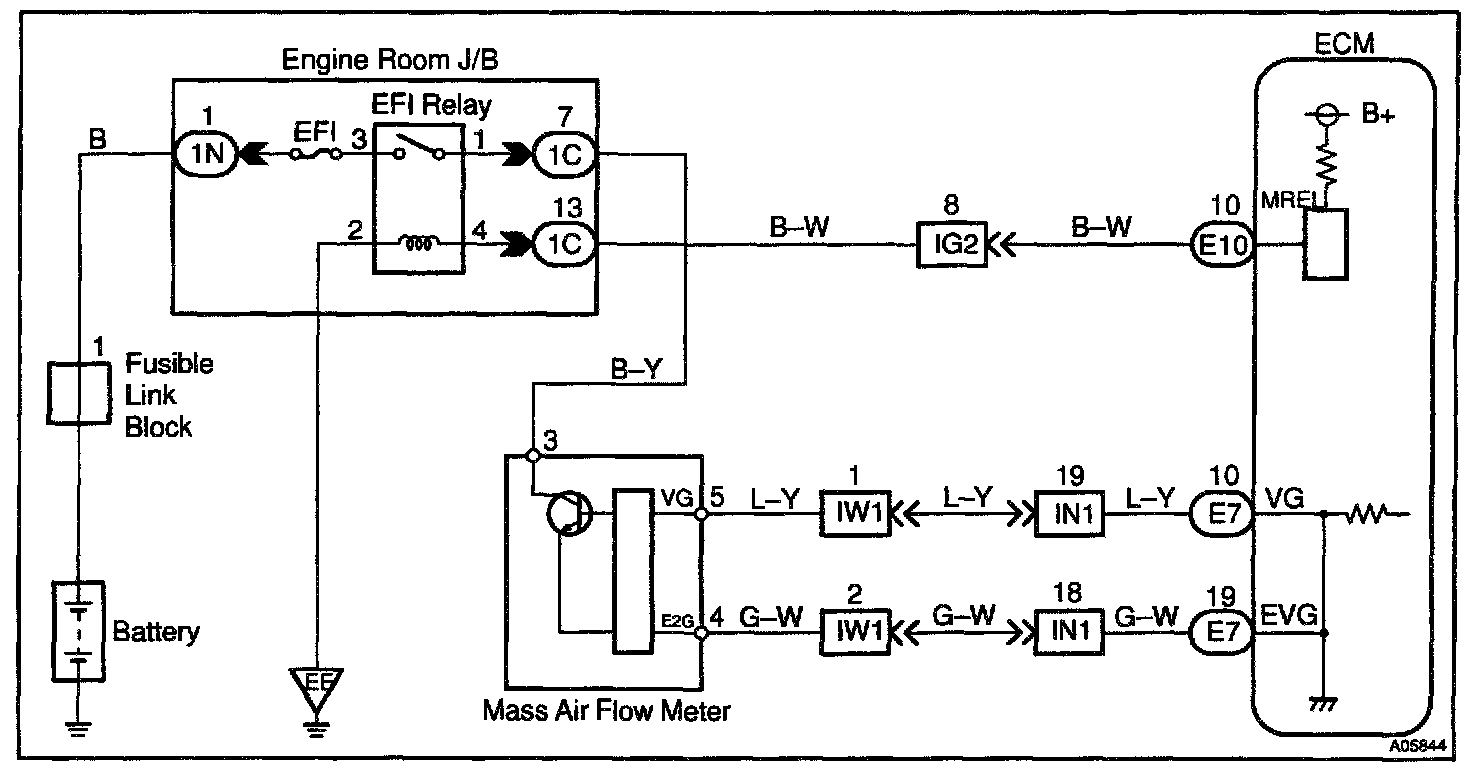 The mass air flow meter uses a platinum hot wire. The hot wire air flow meter consists of a platinum hot wire, thermistor and a control circuit installed in a plastic housing. The hot wire air flow meter works on the principle that the hot wire and thermistor located in the intake air bypass of the housing detect any changes in the intake air temperature.