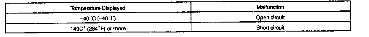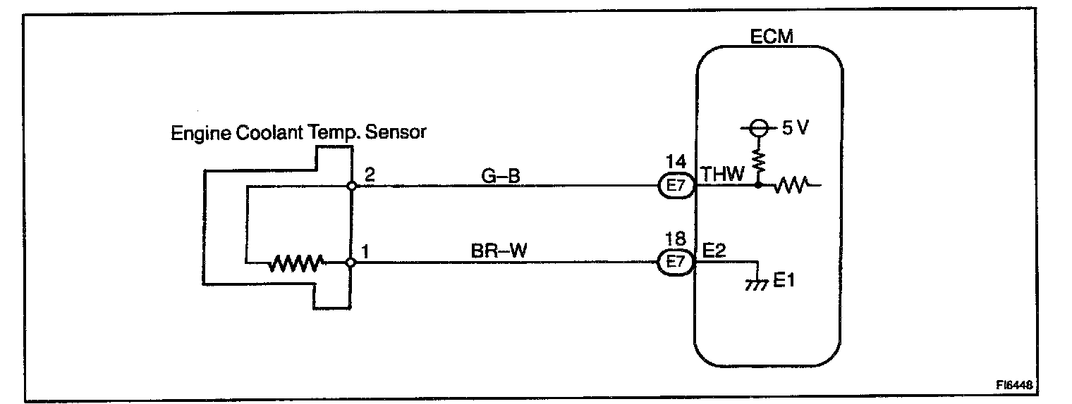 A thermistor built into the engine coolant temperature sensor changes the resistance value according to the engine coolant temperature. The structure of the sensor and connection to the ECM is the same as in the intake air temperature sensor.