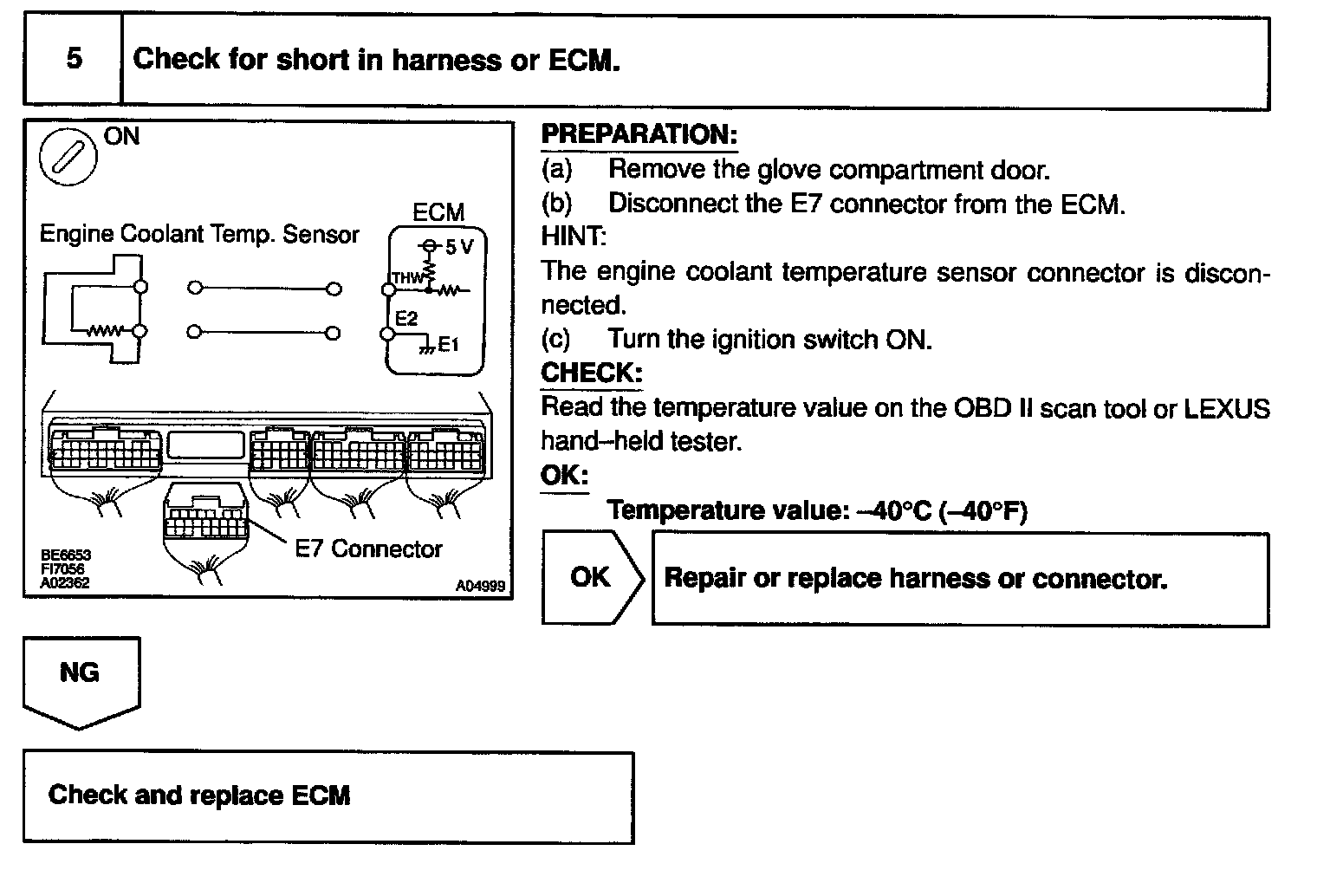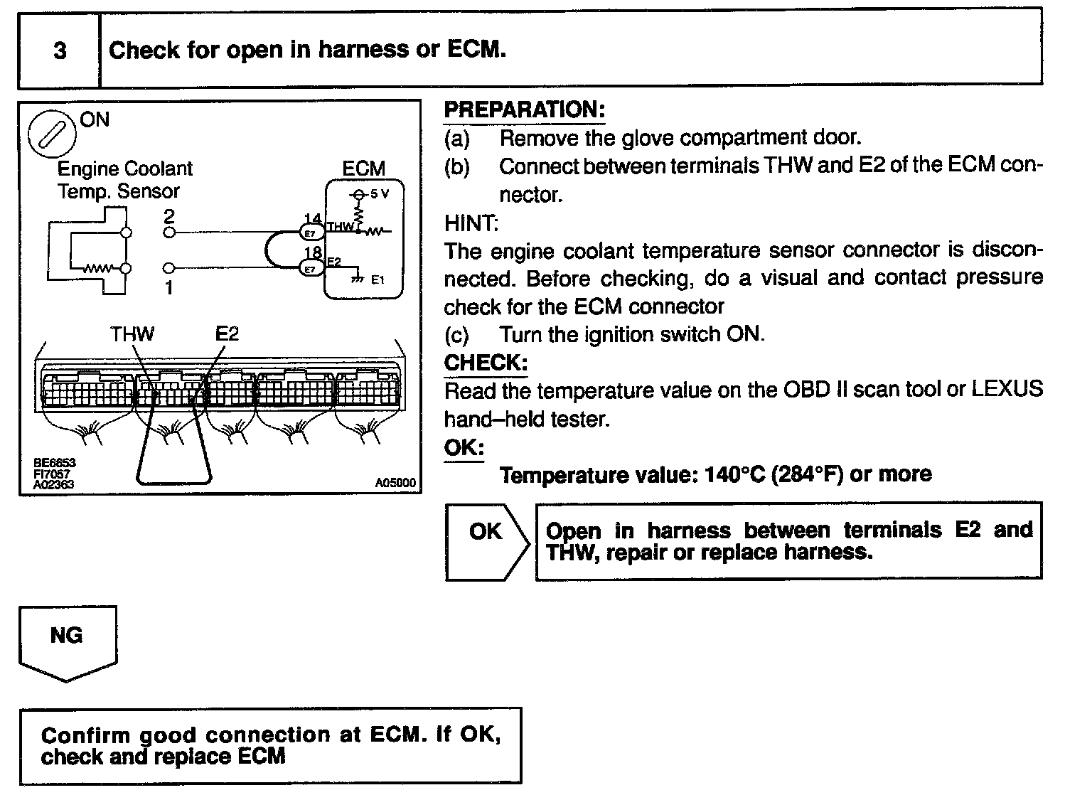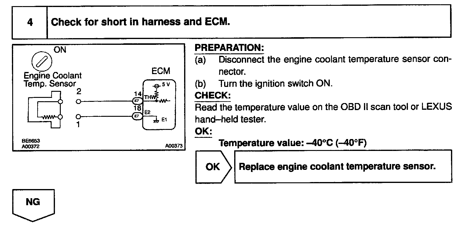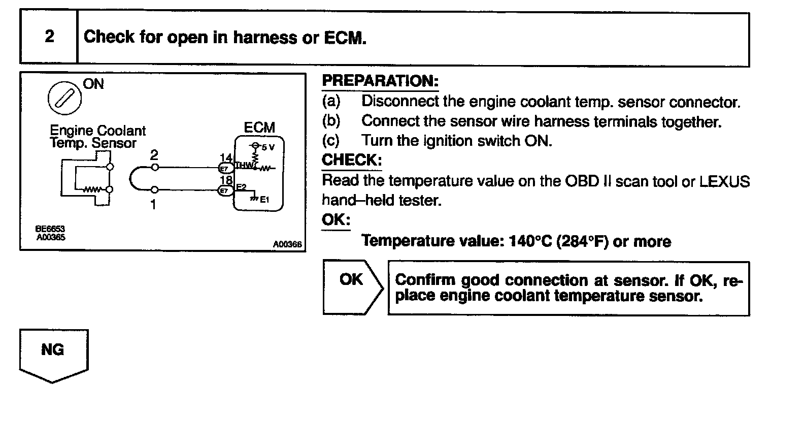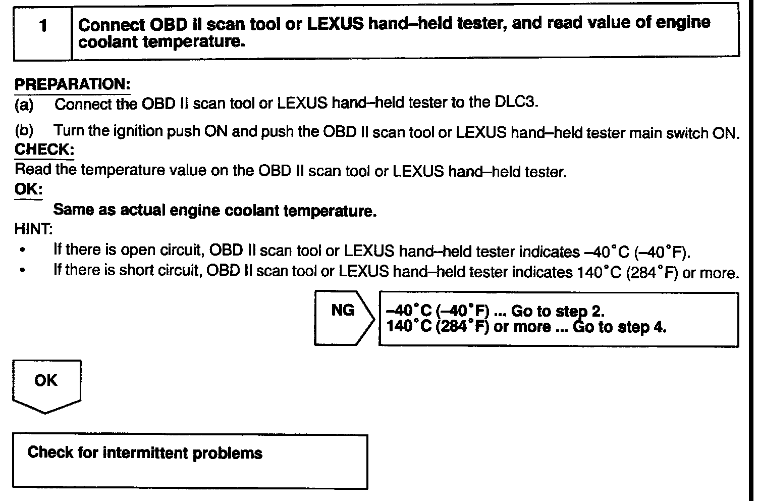 HINT: After confirming DTC P0115, use the OBD II scan tool or LEXUS hand-held tester to confirm the engine coolant temperature from the CURRENT DATA.