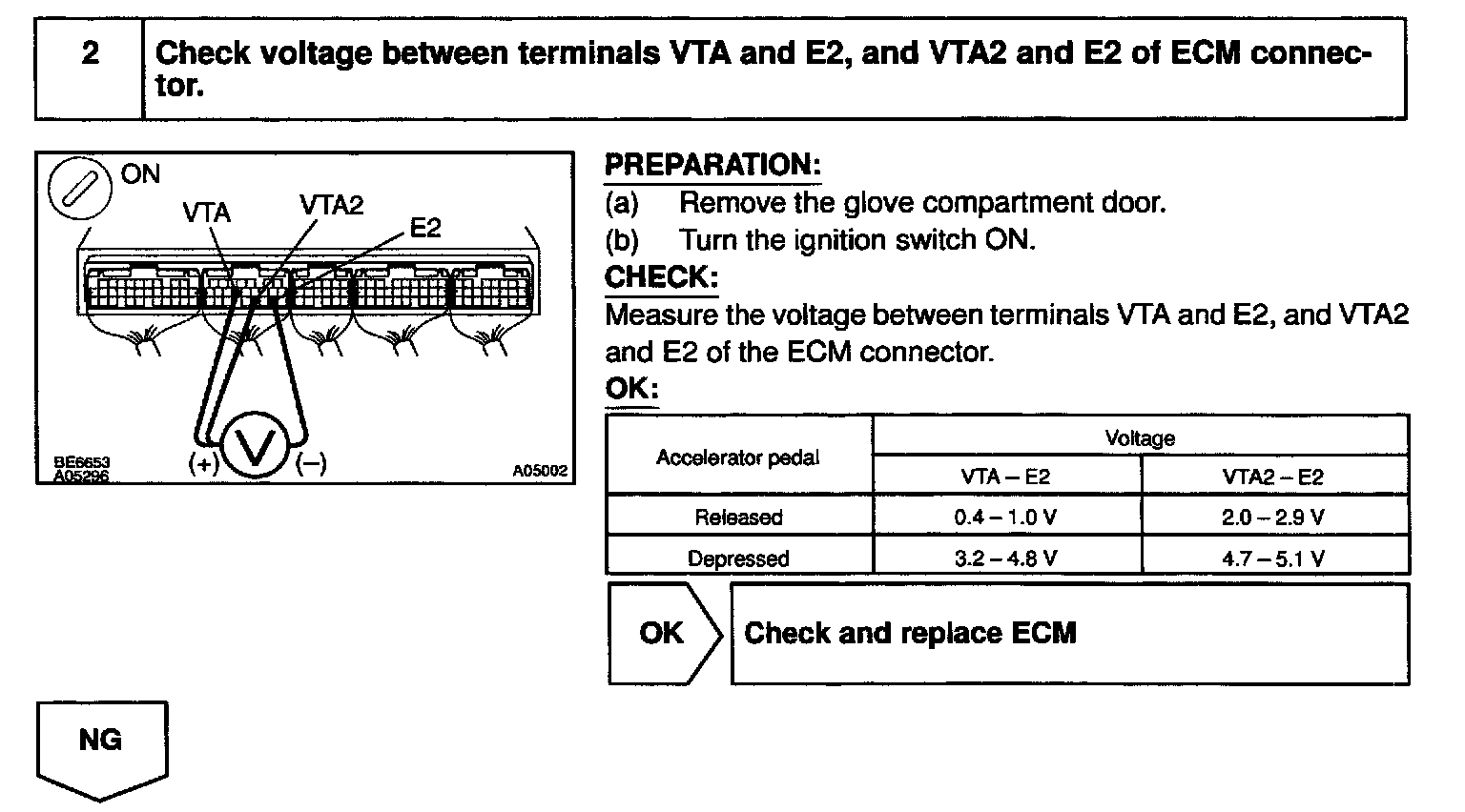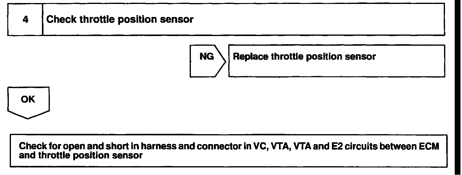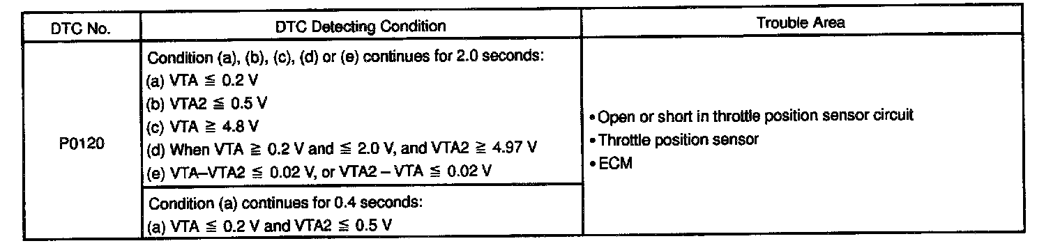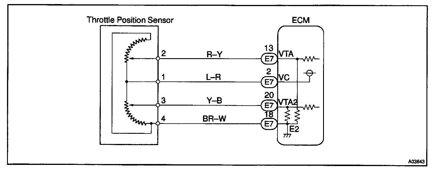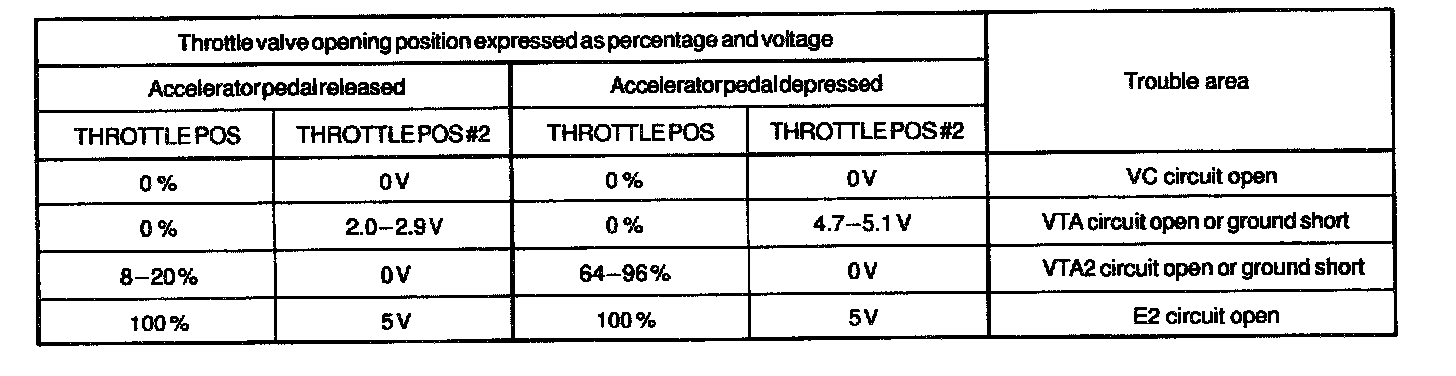 The voltage applied to the terminals VTA and VTA2 of the ECM changes between 0 V and 5 V in proportion to the opening angle of the throttle valve.
