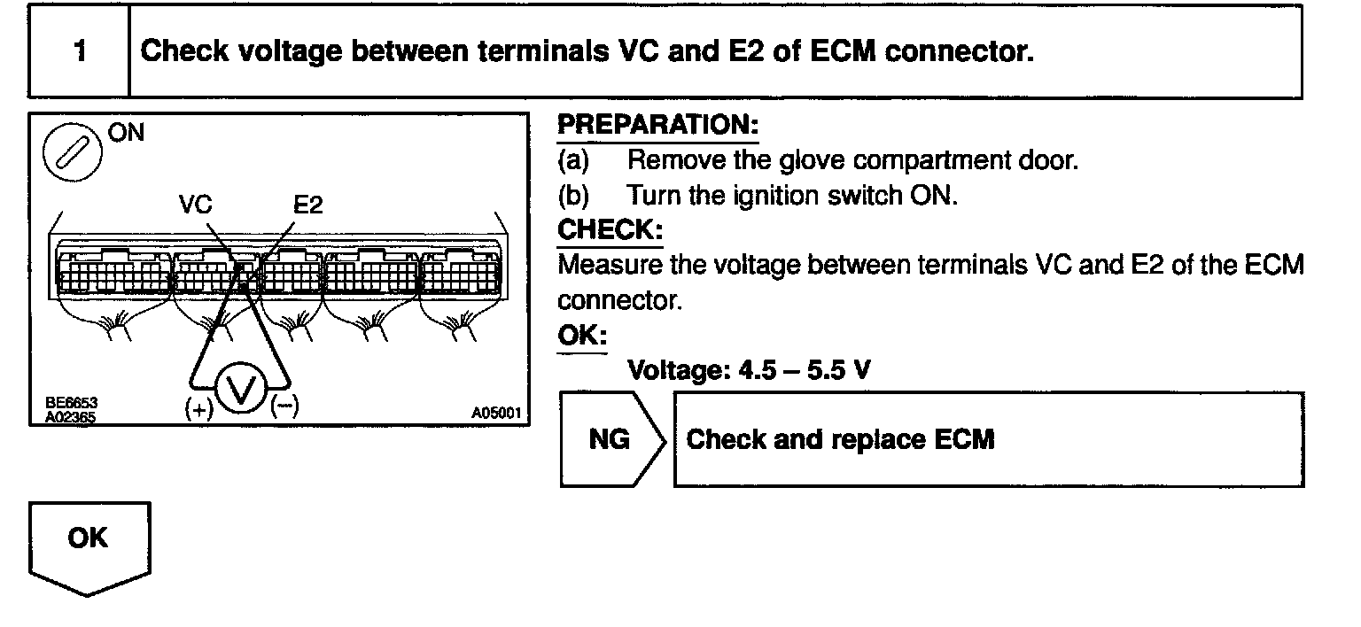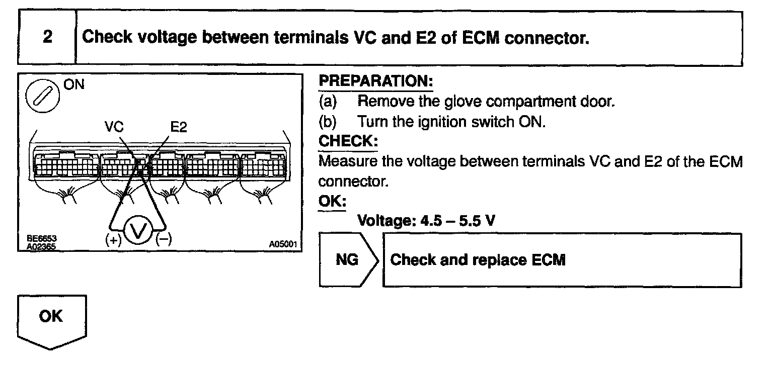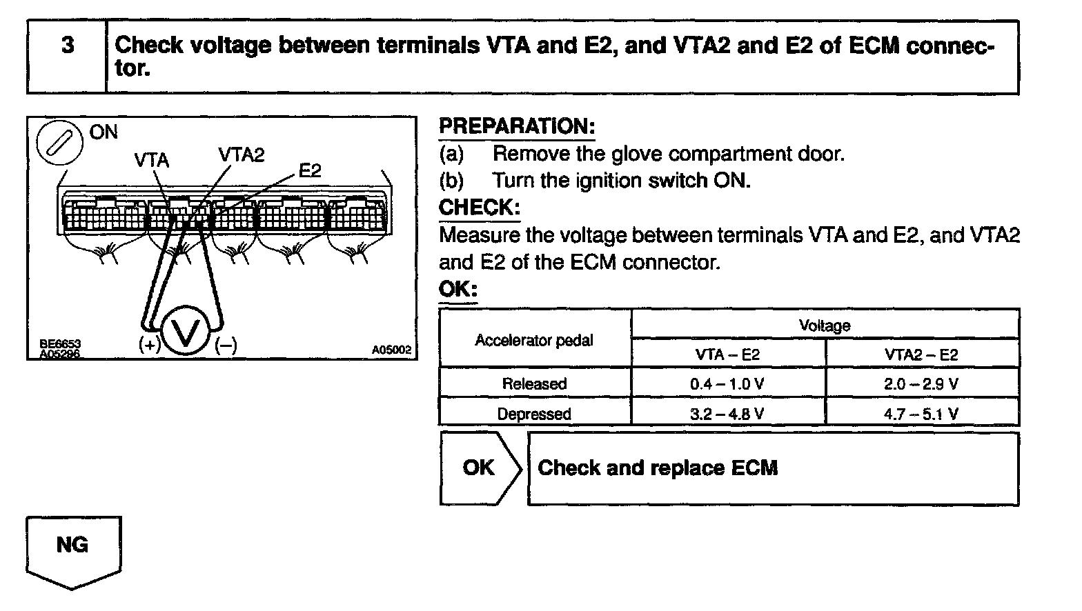 The voltage applied to the terminals VTA and VTA2 of the ECM changes between 0 V and 5 V in proportion to the opening angle of the throttle valve.