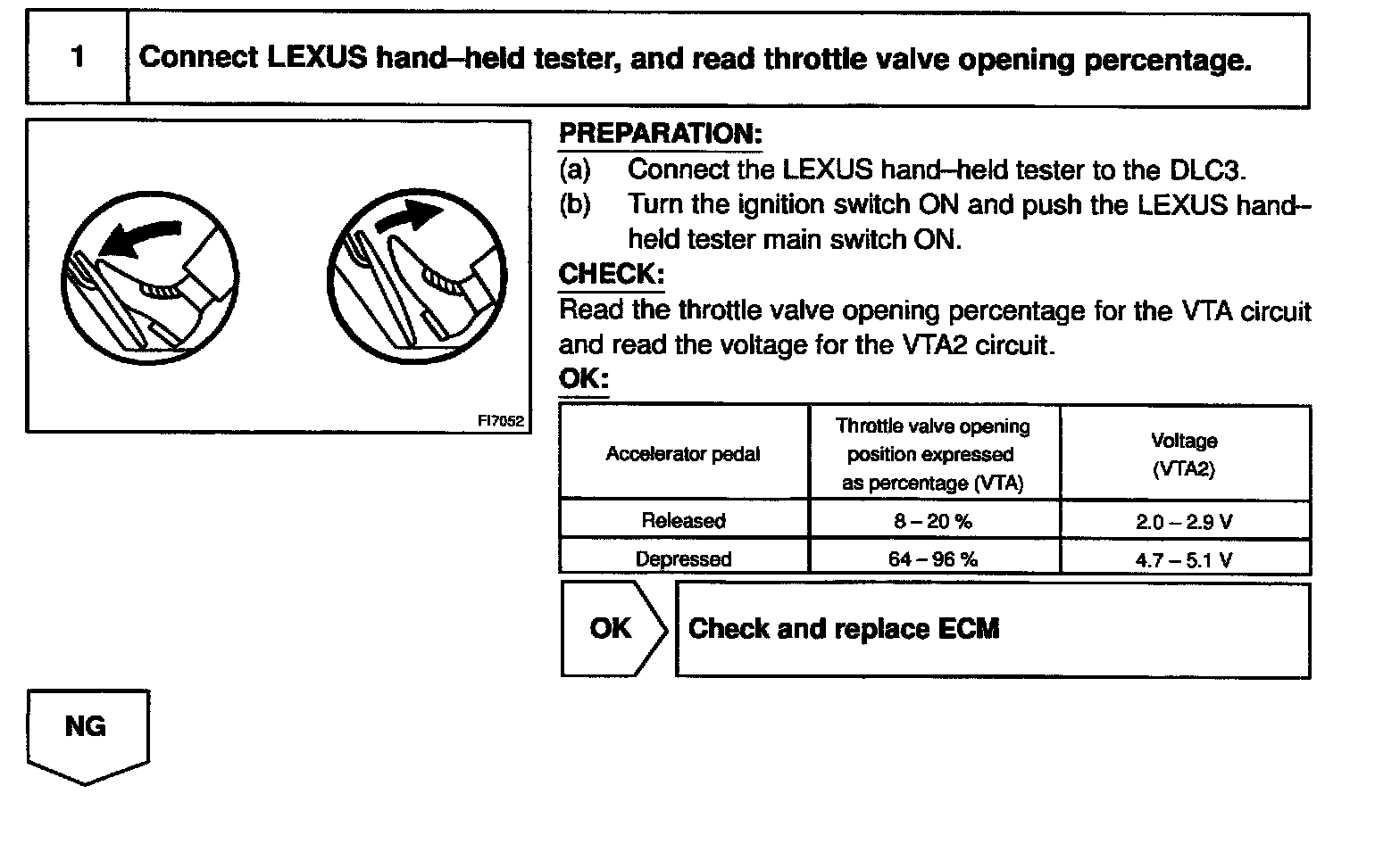 HINT: After confirming DTC P0120, use the OBD II scan tool or LEXUS hand-held tester to confirm the throttle valve opening percentage and closed throttle position switch condition.