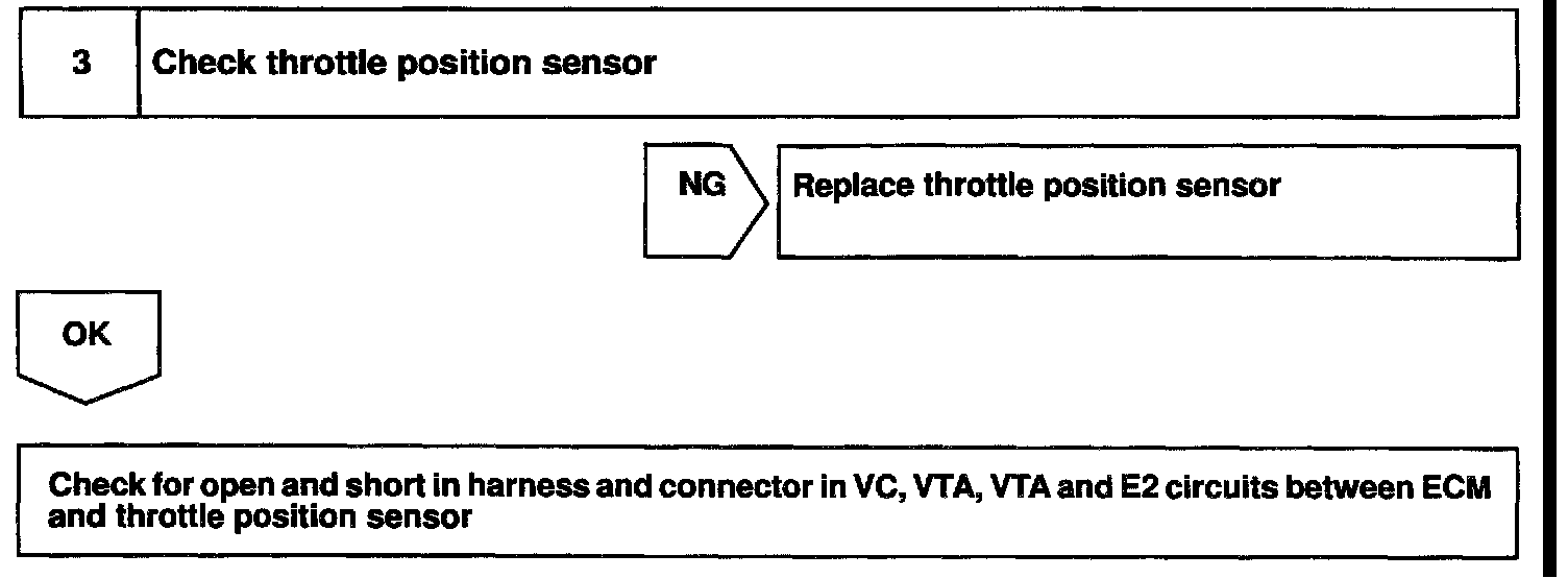 The ECM judges the current opening angle of the throttle valve from these signals input from terminals VTA and VTA2, and the ECM controls the throttle motor to make the throttle valve angle properly in response to driving condition.