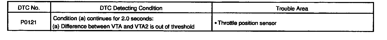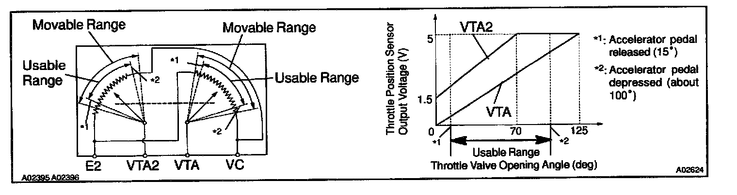 The ECM judges the current opening angle of the throttle valve from these signals input from terminals VTA and VTA2, and the ECM controls the throttle motor to make the throttle valve angle properly in response to driving condition.