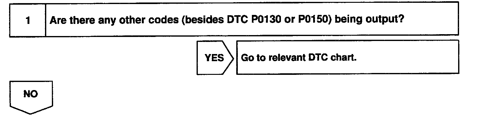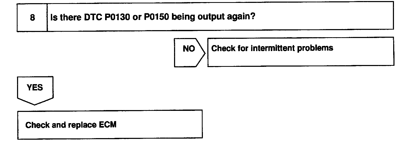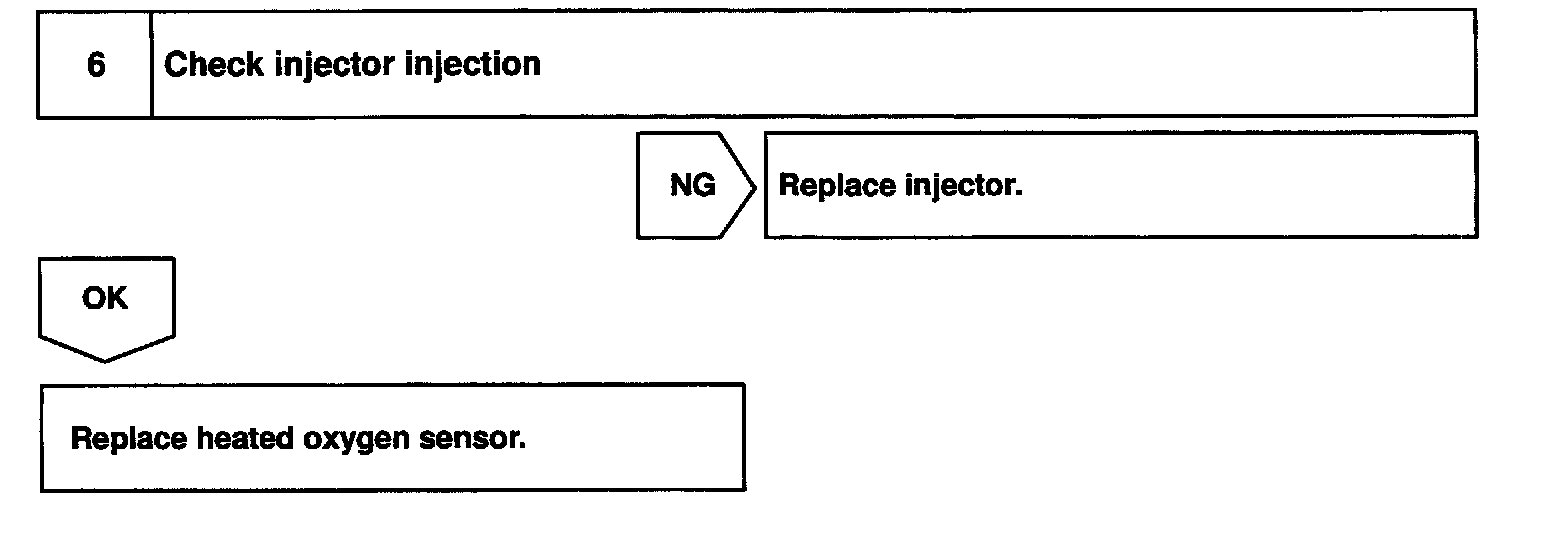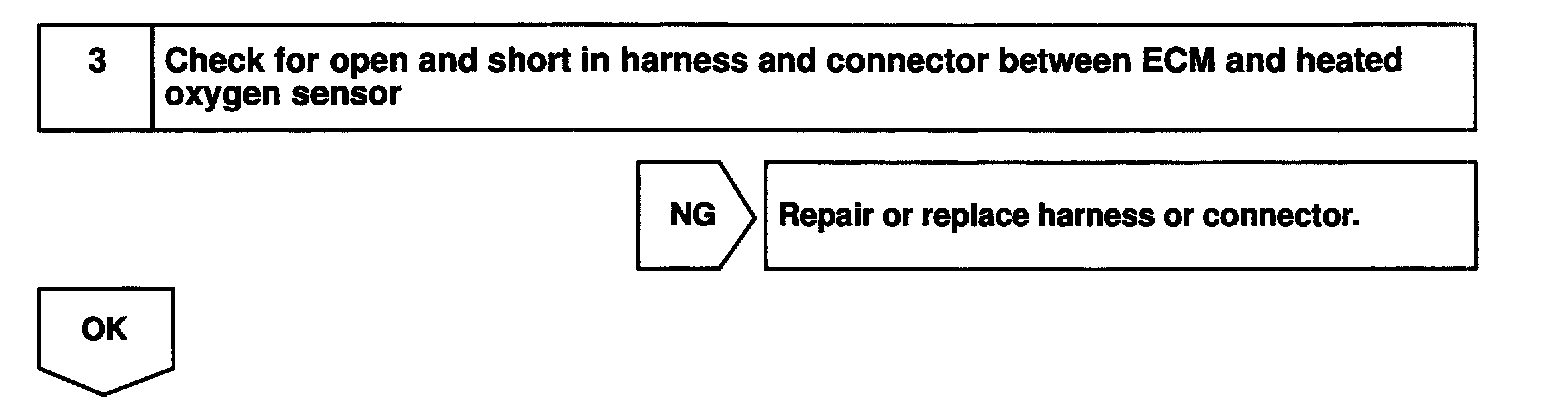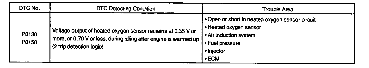 When the air-fuel ratio is RICHER than the stoichiometric air-fuel ratio the oxygen concentration in the exhaust gas is reduced and the oxygen sensor informs the ECM of the RICH condition (large electromotive force: > 0.45 V). The ECM judges by the electromotive force from the oxygen sensor whether the air-fuel ratio is RICH or LEAN and controls the injection time accordingly. However, if malfunction of the oxygen sensor causes output of abnormal electromotive force, the ECM is unable to perform accurate air-fuel ratio control. The heated oxygen sensors include a heater which heats the zirconia element. The heater is controlled by the ECM. When the intake air volume is low (the temperature of the exhaust gas is low) current flows to the heater to heat the sensor for accurate oxygen concentration detection.