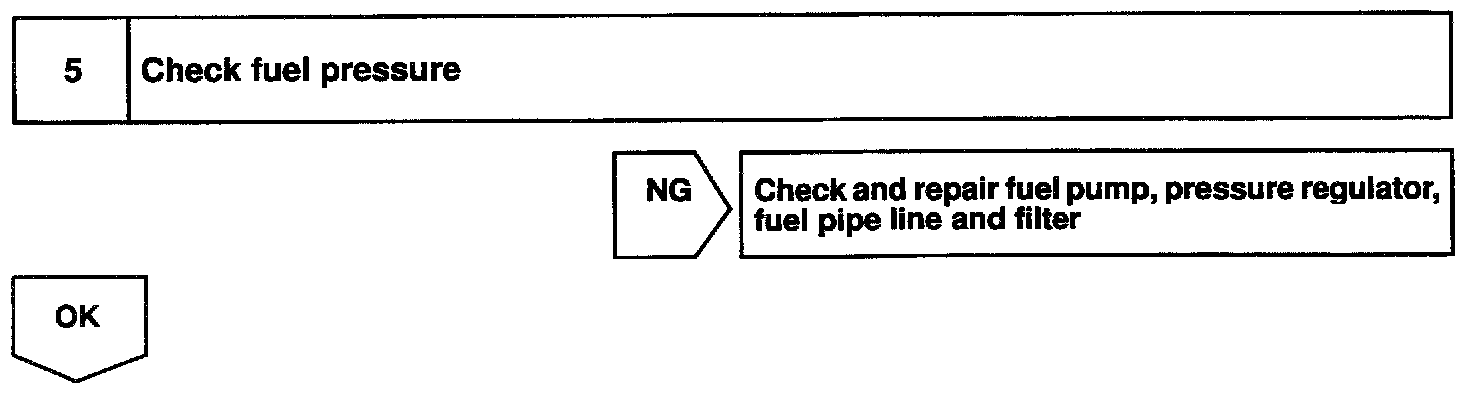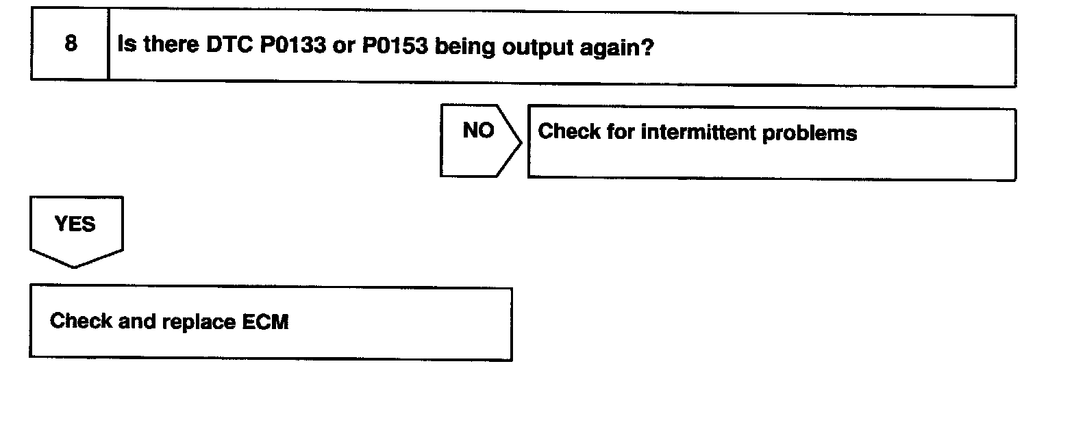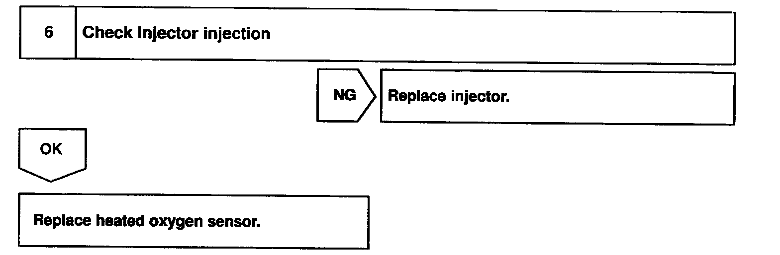 When the air-fuel ratio is RICHER than the stoichiometric air-fuel ratio the oxygen concentration in the exhaust gas is reduced and the oxygen sensor informs the ECM of the RICH condition (large electromotive force: > 0.45 V). The ECM judges by the electromotive force from the oxygen sensor whether the air-fuel ratio is RICH or LEAN and controls the injection time accordingly. However, if malfunction of the oxygen sensor causes output of abnormal electromotive force, the ECM is unable to perform accurate air-fuel ratio control. The heated oxygen sensors include a heater which heats the zirconia element. The heater is controlled by the ECM. When the intake air volume is low (the temperature of the exhaust gas is low) current flows to the heater to heat the sensor for accurate oxygen concentration detection.