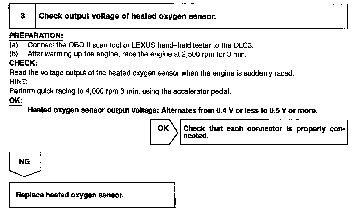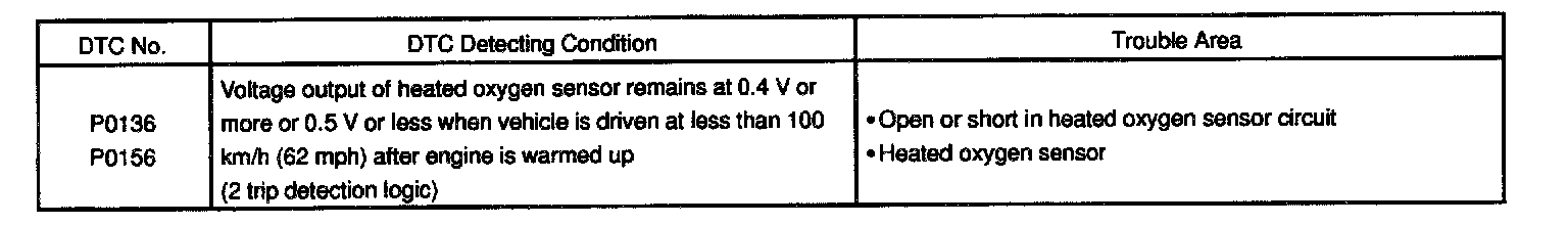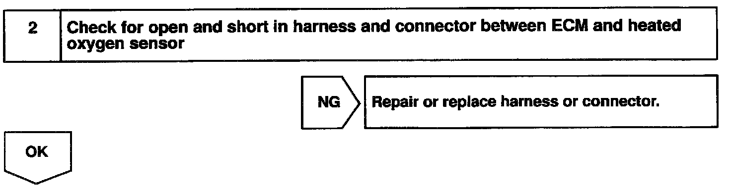When the air-fuel ratio is RICHER than the stoichiometric air-fuel ratio the oxygen concentration in the exhaust gas is reduced and the oxygen sensor informs the ECM of the RICH condition (large electromotive force: > 0.45 V). The ECM judges by the electromotive force from the oxygen sensor whether the air-fuel ratio is RICH or LEAN and controls the injection time accordingly. However, if malfunction of the oxygen sensor causes output of abnormal electromotive force, the ECM is unable to perform accurate air-fuel ratio control. The heated oxygen sensors include a heater which heats the zirconia element. The heater is controlled by the ECM. When the intake air volume is low (the temperature of the exhaust gas is low) current flows to the heater to heat the sensor for accurate oxygen concentration detection.