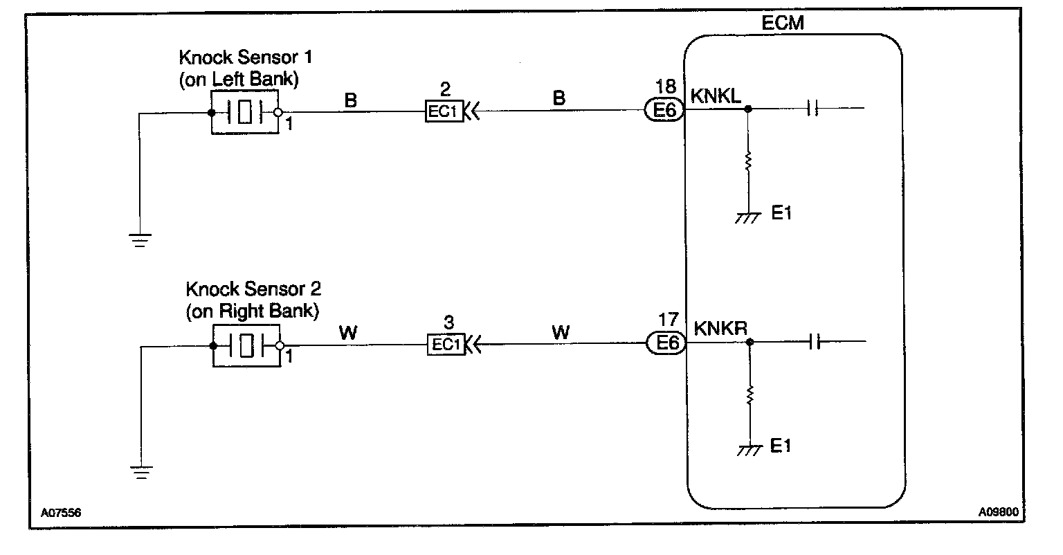 CIRCUIT DESCRIPTIONEach knock sensor is fitted to the right bank and left bank of the cylinder block to detect engine knocking. This sensor contains a piezoelectric element which generates a voltage when it becomes deformed, which occurs when the cylinder block vibrates due to knocking. If engine knocking occurs, ignition timing is retarded to suppress it.