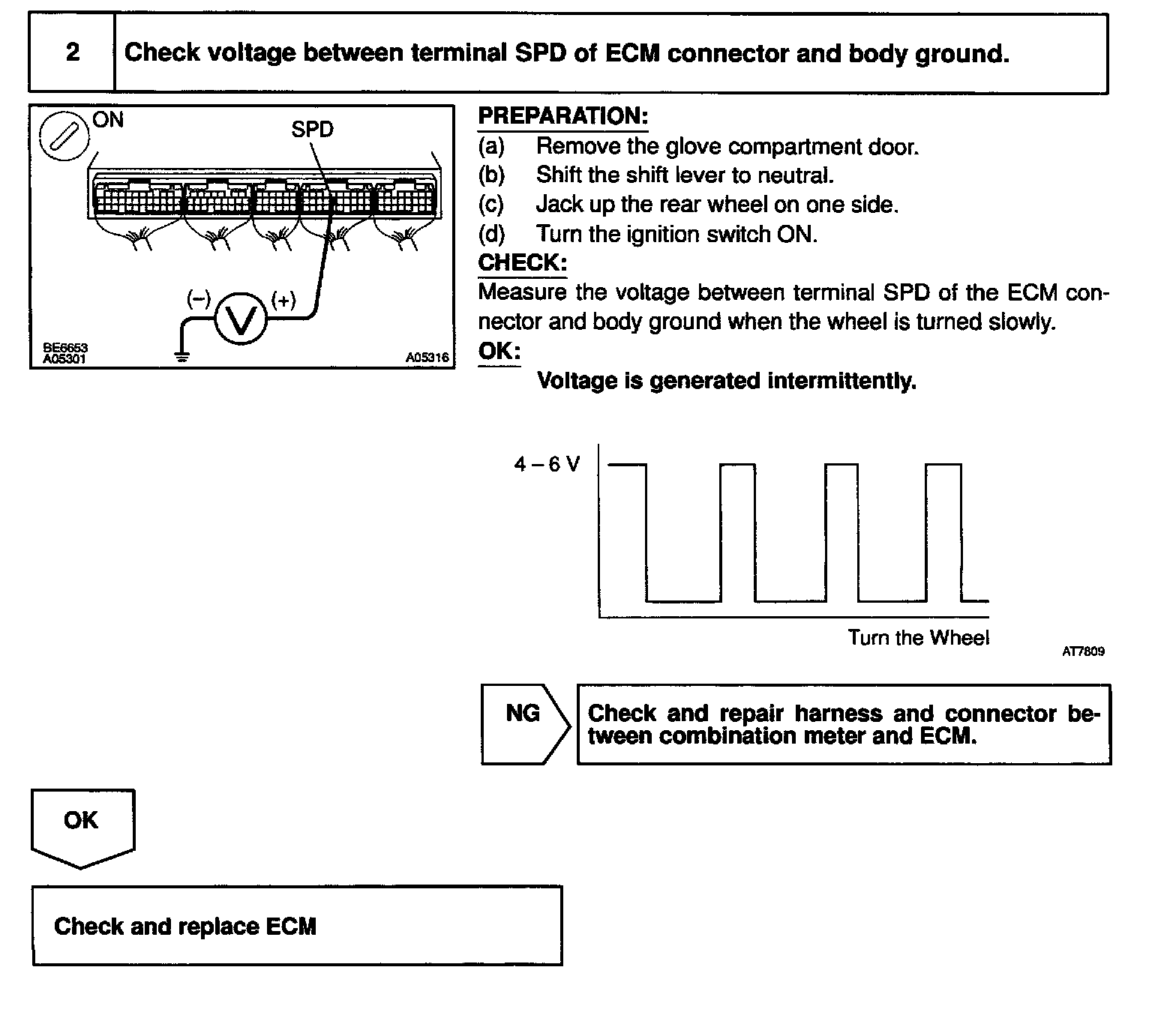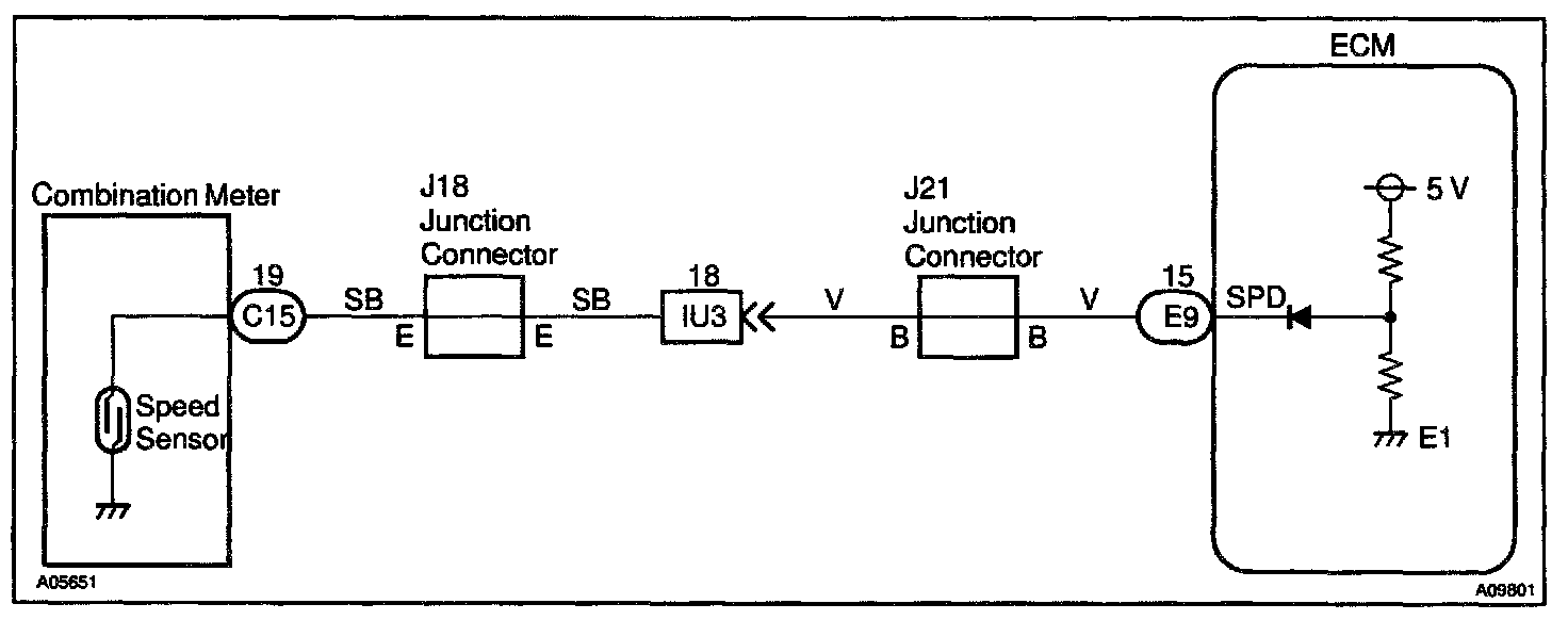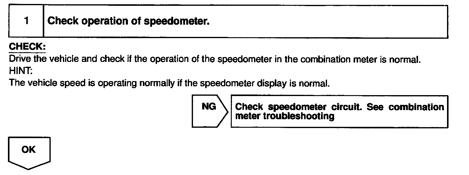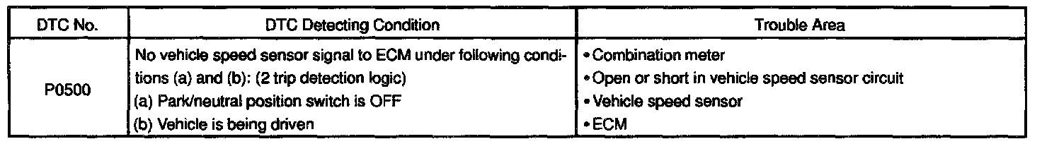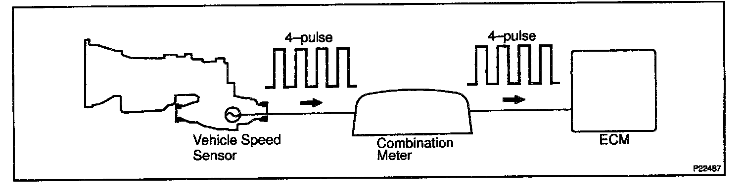 The No.1 vehicle speed sensor outputs a 4-pulse signal for every revolution of the rotor shaft, which is rotated by the transmission output shaft via the driven gear. After this signal is converted into a more precise rectangular waveform by the waveform shaping circuit inside the combination meter, it is then transmitted to the ECM. The ECM determines the vehicle speed based on the frequency of these pulse signals.