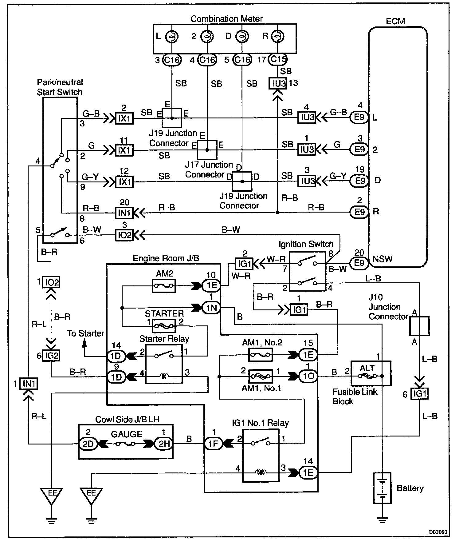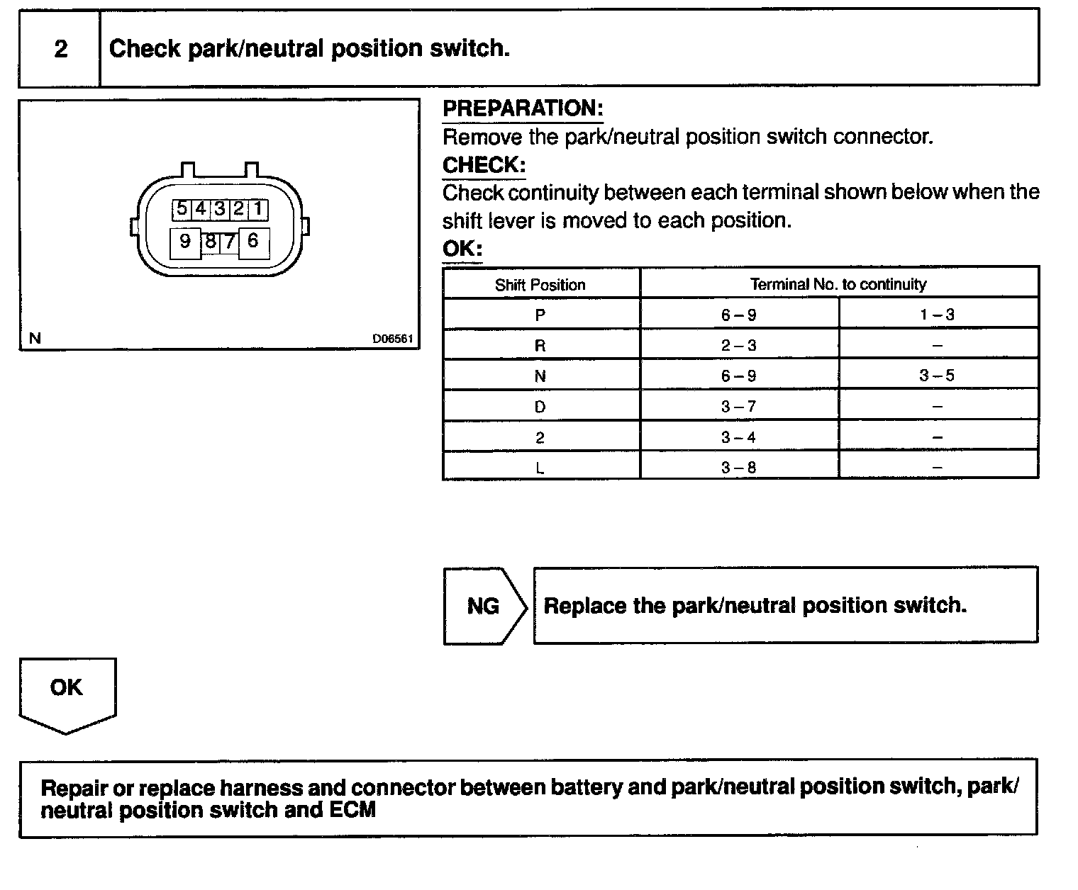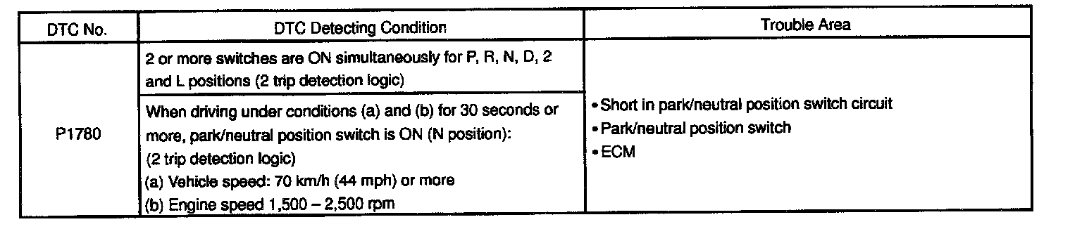 CIRCUIT DESCRIPTIONThe park/neutral position switch go on when the shift lever is in the N or P shift position. When it goes on terminal NSW of the ECM is grounded to body ground via the starter relay, thus the terminal NSW voltage becomes 0 V. When the shift lever is in the D, 2, L or R position, the park/neutral position switch goes off, so the voltage of ECM. Terminal NSW becomes battery voltage, the voltage of the ECM internal power source. If the shift lever is moved from the N position to the D position, this signal is used for air-fuel ratio correction and for idle speed control (estimated control), etc.