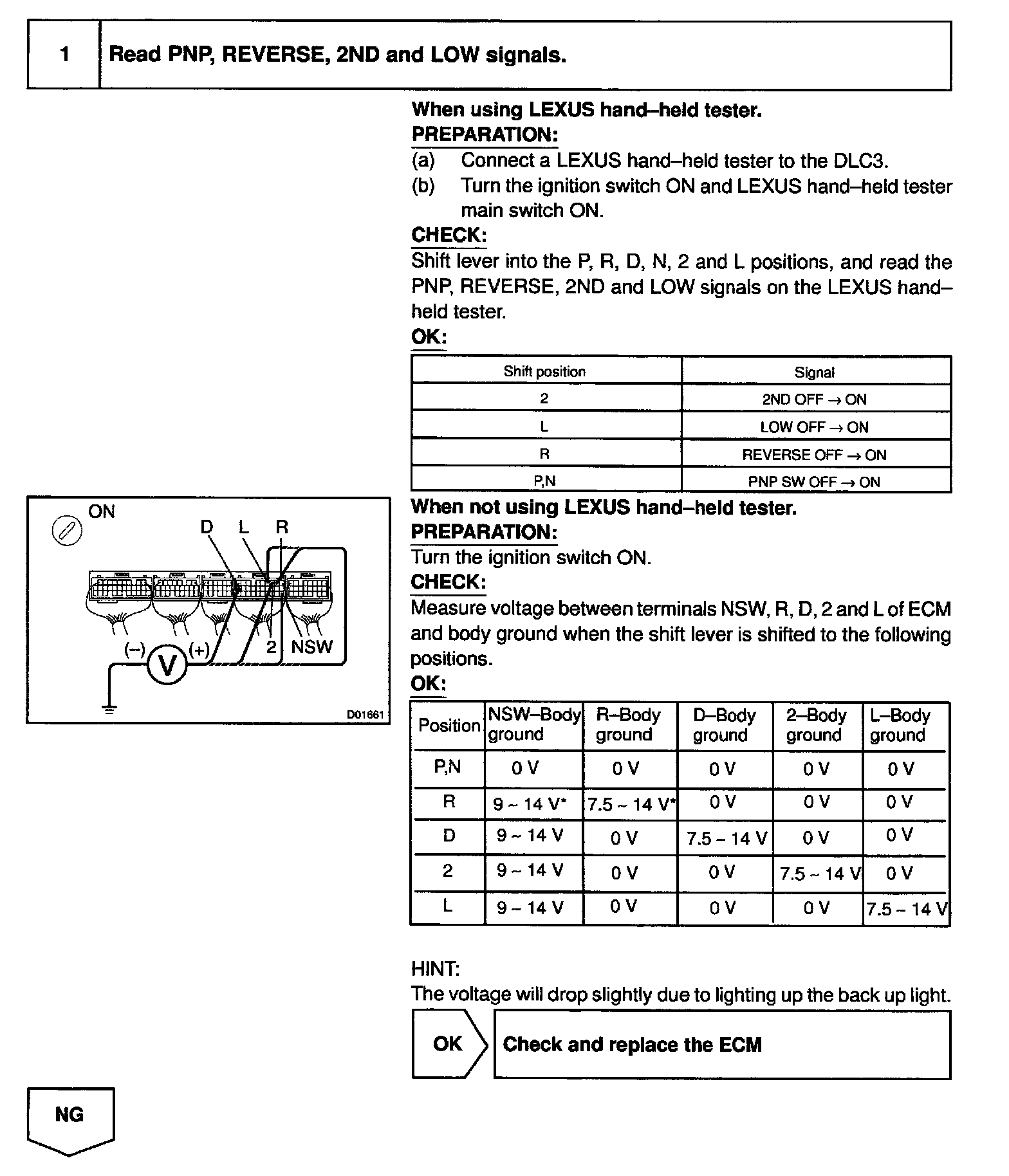HINT: After confirming DTC P1780, use the LEXUS hand-held tester to confirm the PNP switch signal from the CURRENT DATA.