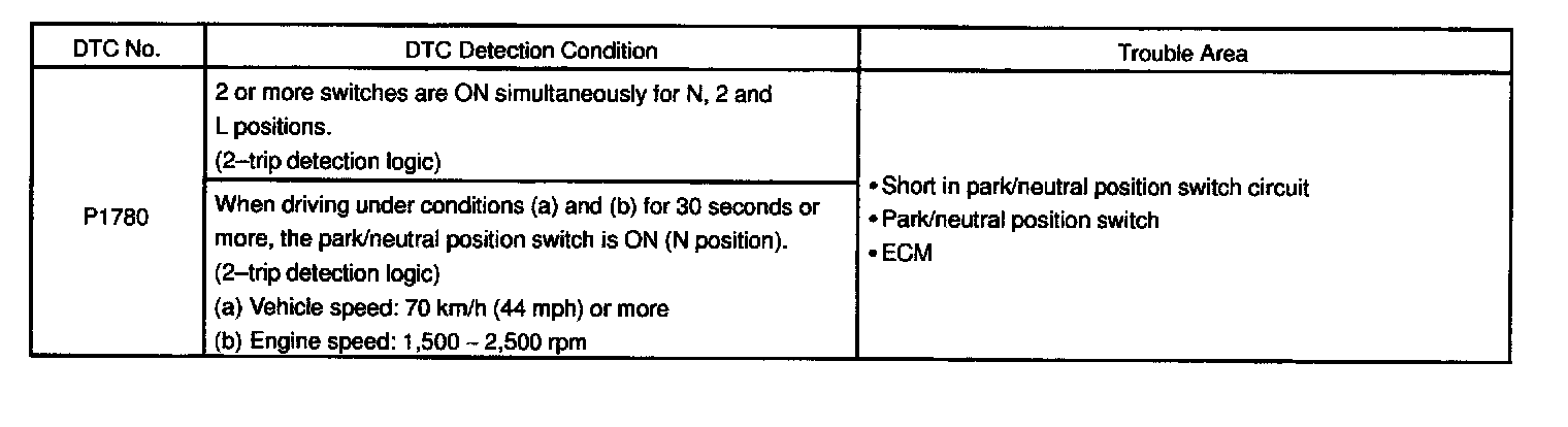 The ECM receives signals (NSW, R, D, 2 and L) from the park/neutral position switch. When the signal is not sent to the ECM from the park/neutral position switch, the ECM judges that the shift lever is in D position.