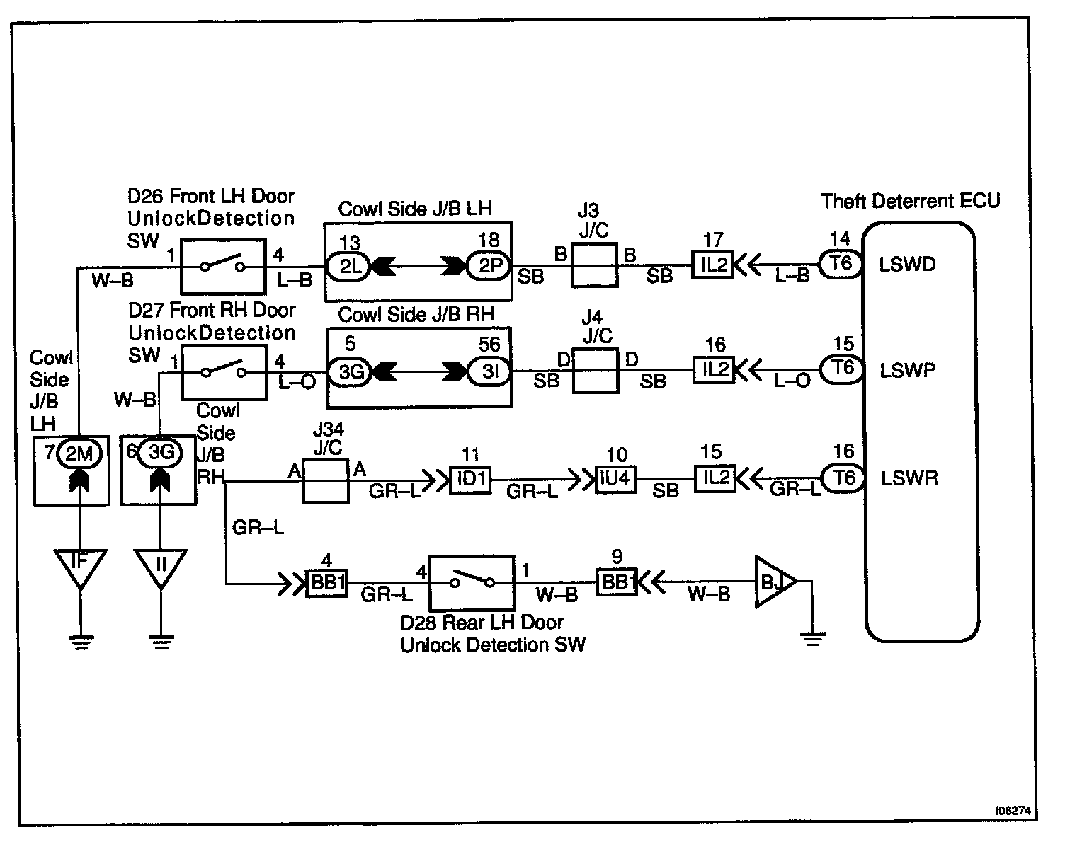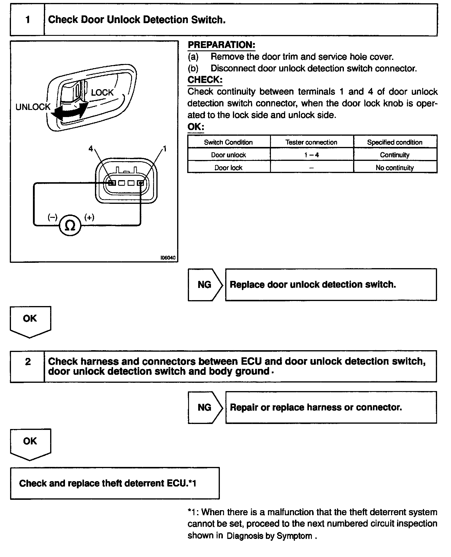 CIRCUIT DESCRIPTIONThe door unlock detection switch is built in the door lock motor assembly. This switch is ON when the door lock knob is in the unlock position and OFF when the lock knob is in the lock position. The ECU detects the door lock knob conditions from this circuit. It is used as one of the operating conditions for the key confinement prevention function.