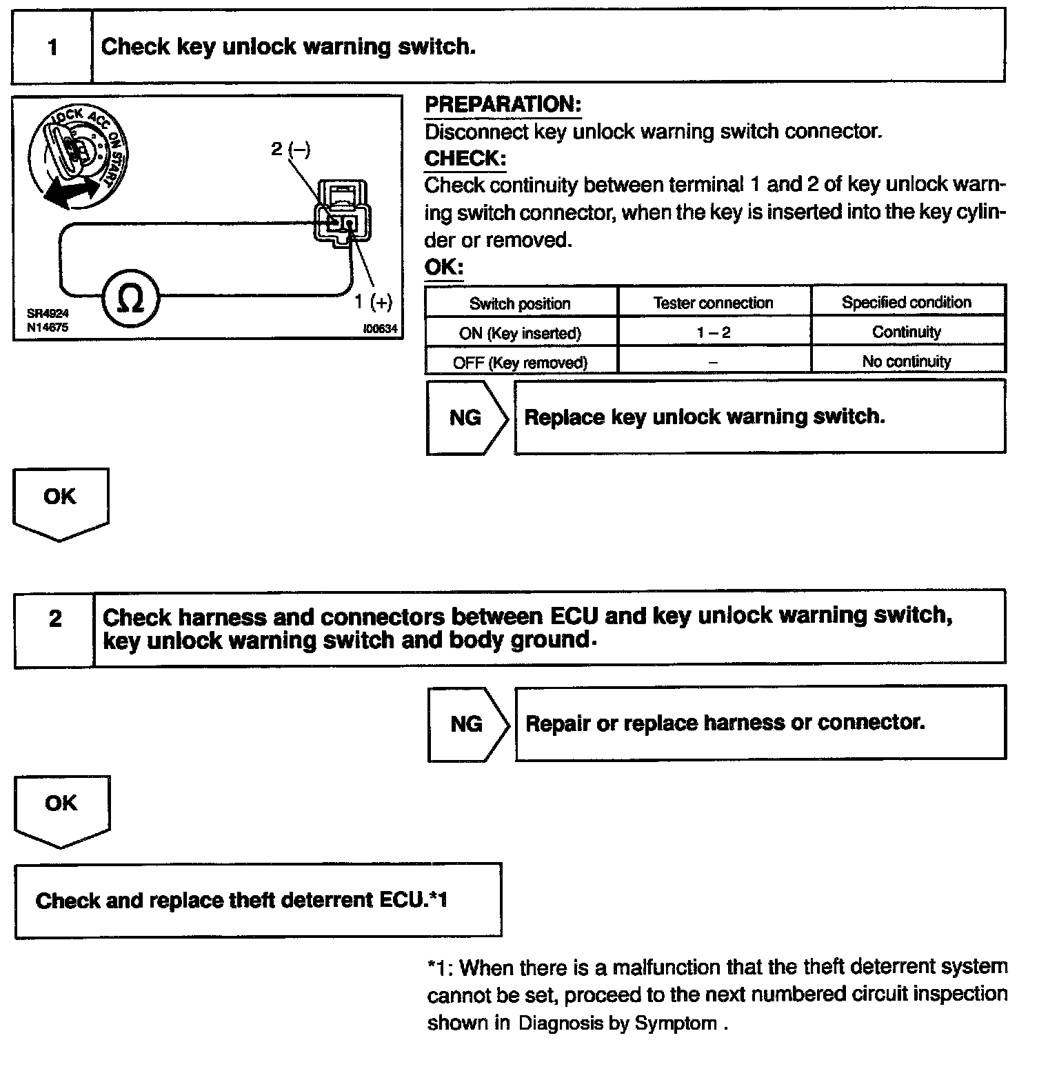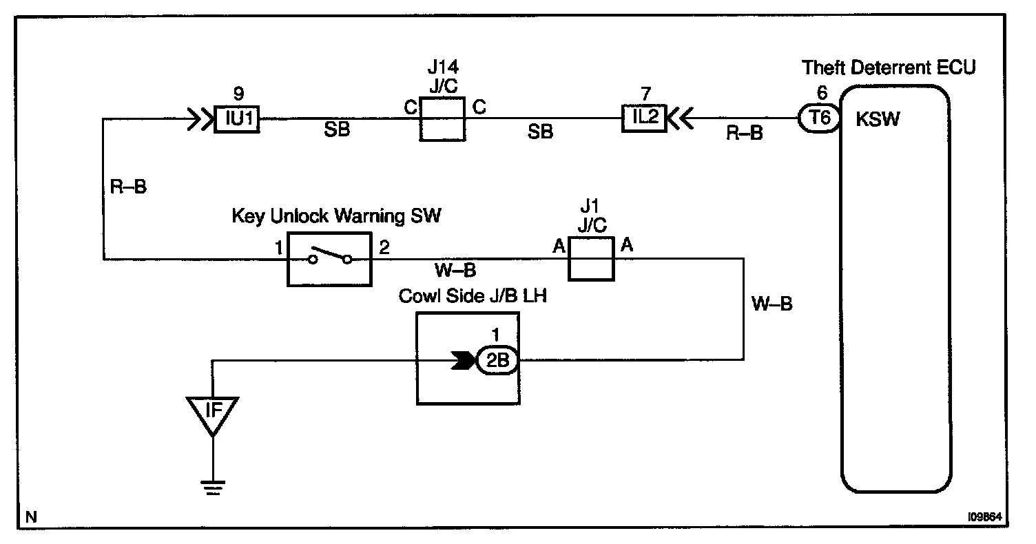 CIRCUIT DESCRIPTIONThe key unlock warning switch goes ON when the ignition key is inserted in the key cylinder and goes OFF when the ignition key is removed.