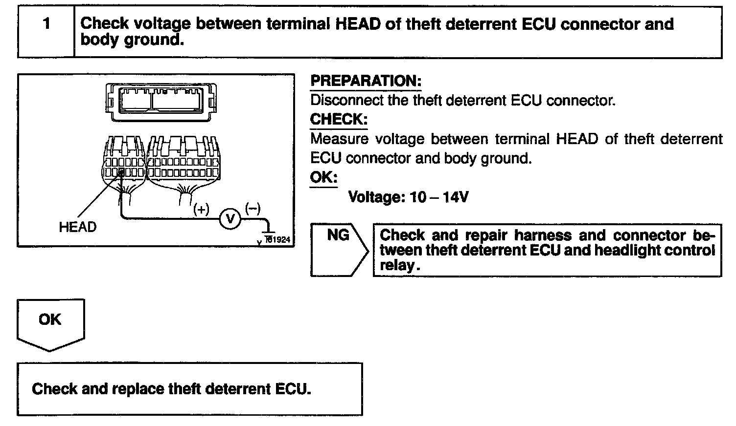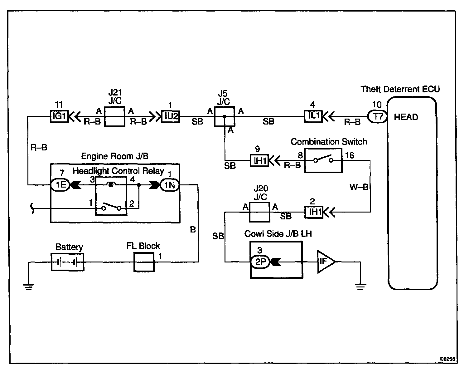 CIRCUIT DESCRIPTIONWhen the theft deterrent system is activated, it causes the Tr in the ECU to switch ON and OFF at approximately 0.4 sec. intervals. This switches the headlight control relay ON and OFF, thus flashing the headlights (See the wiring diagram).