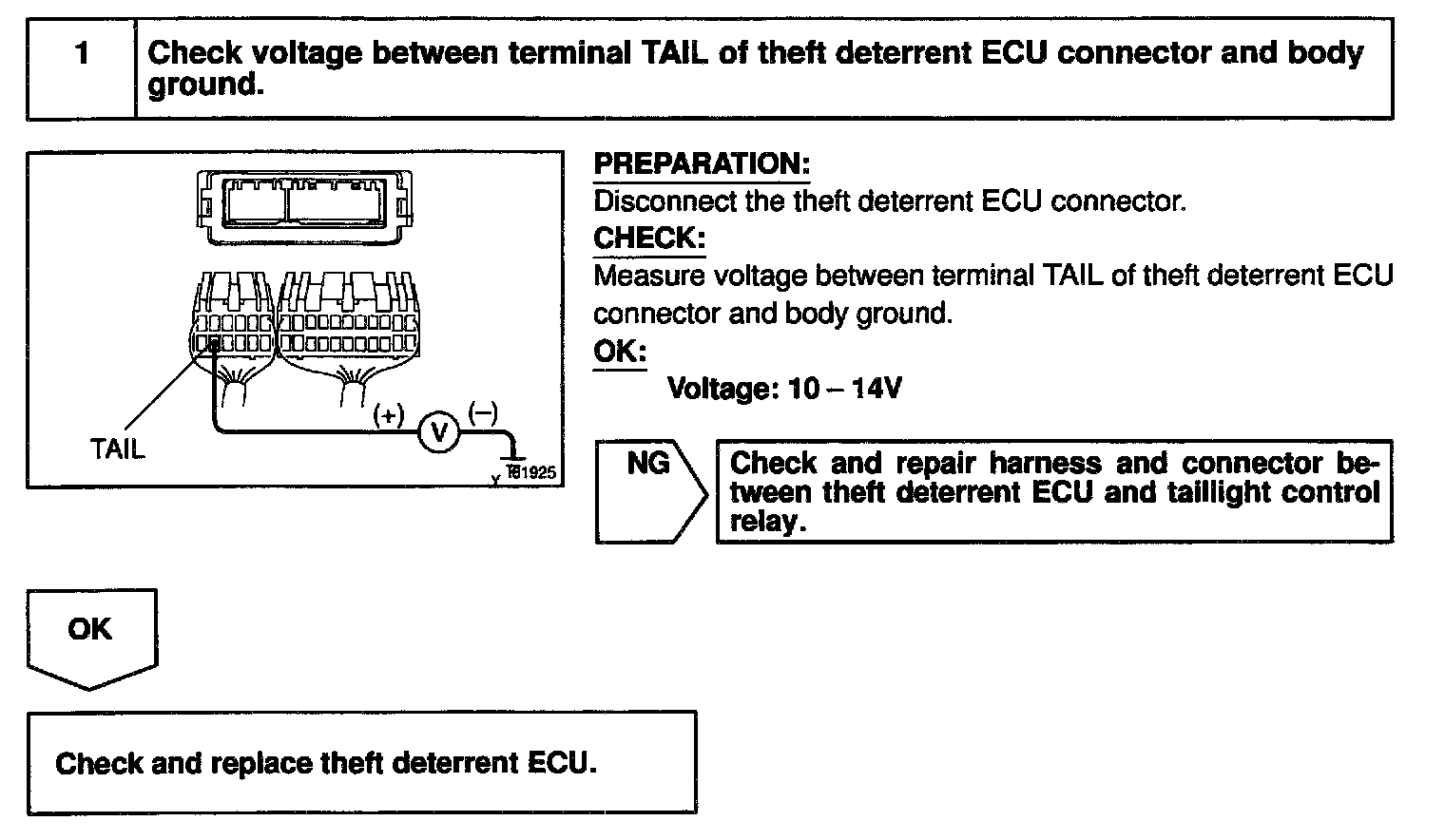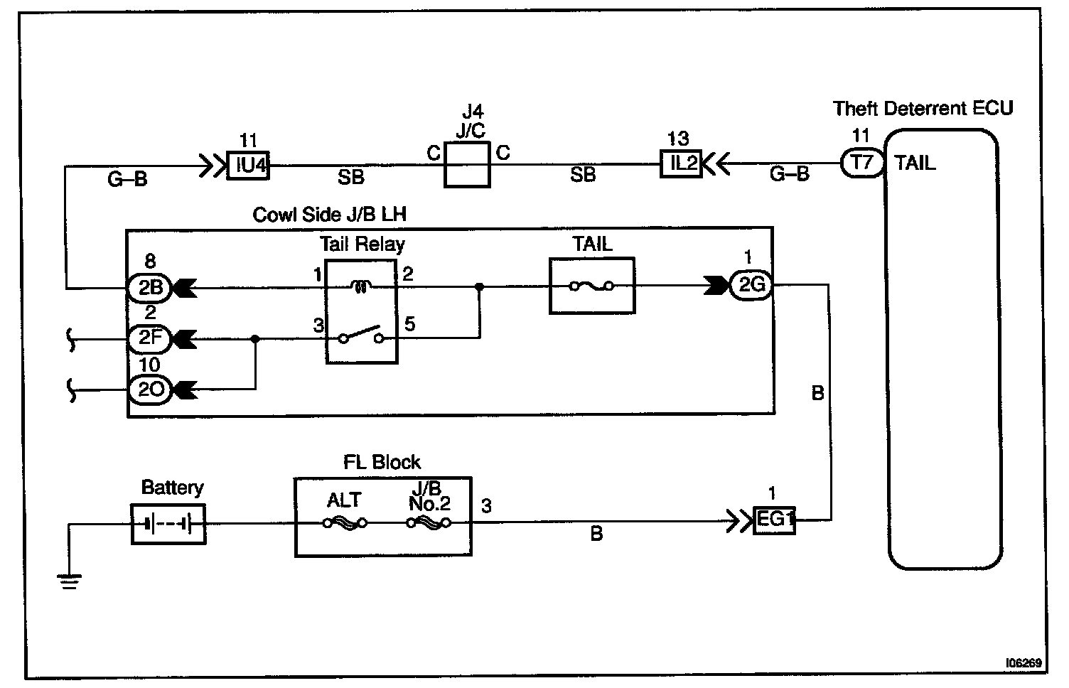 CIRCUIT DESCRIPTIONWhen the theft deterrent system is activated, it causes the Tr in the ECU to switch ON and OFF at approximately 0.4 Sec. intervals. This switches the taillight control relay ON and OFF, thus flashing the taillights (See the wiring diagram).