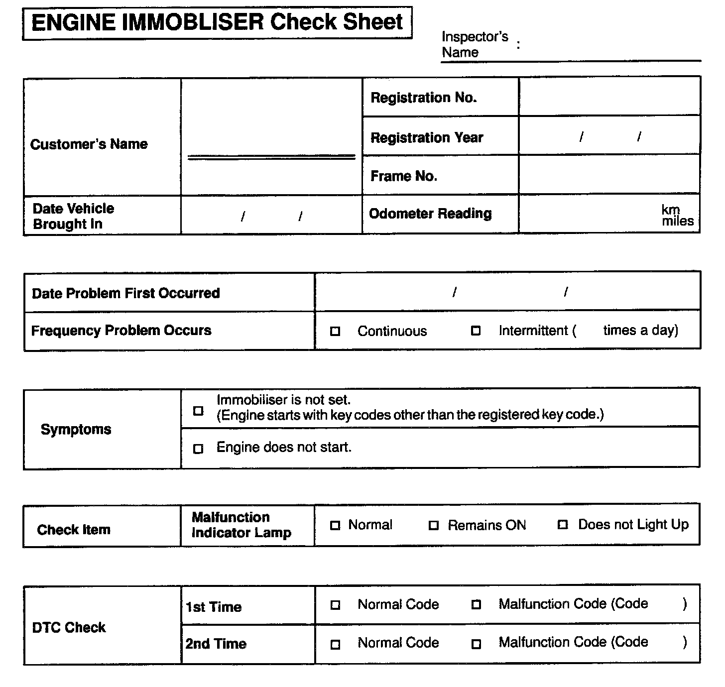 Engine Immobilizer Check Sheet: