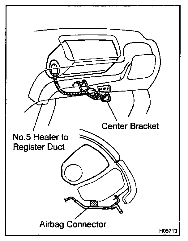 - Install the airbag connector between the No. 5 heater to register duct and center bracket temporarily, then install the instrument panel.