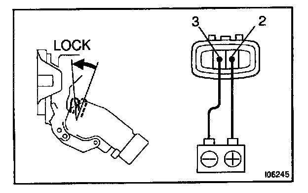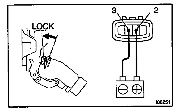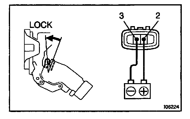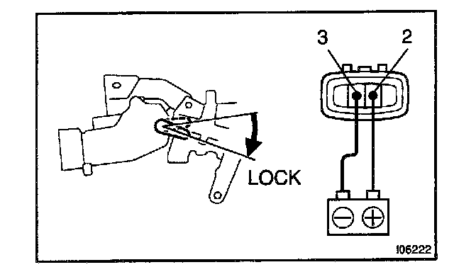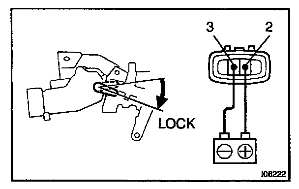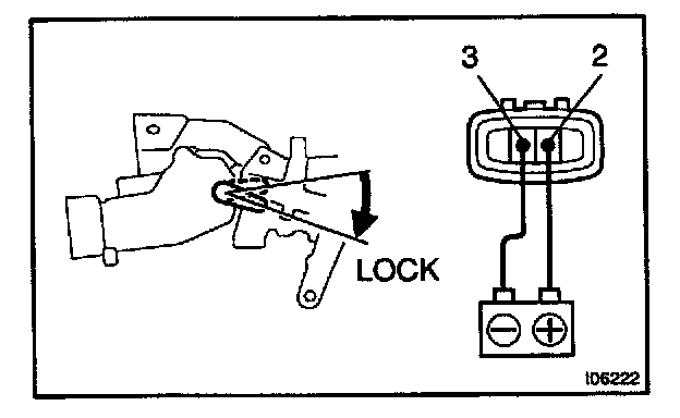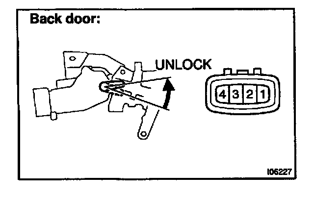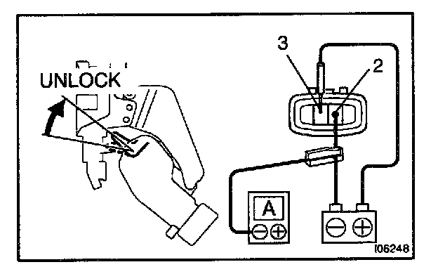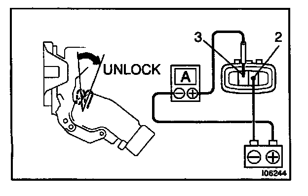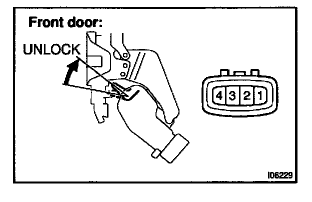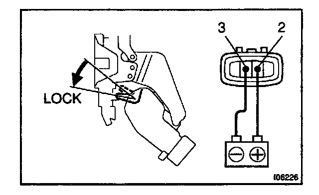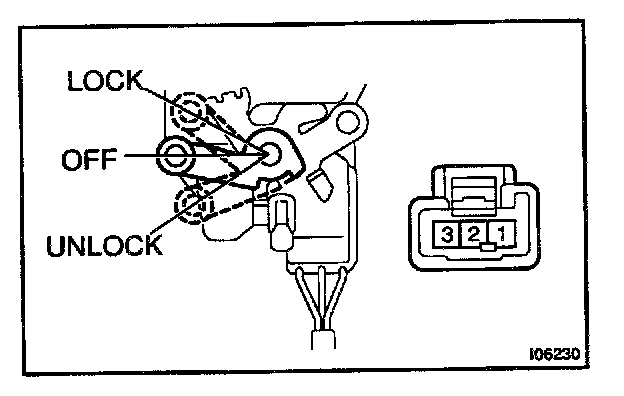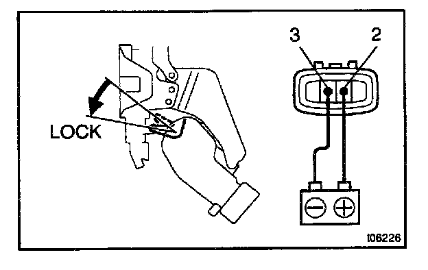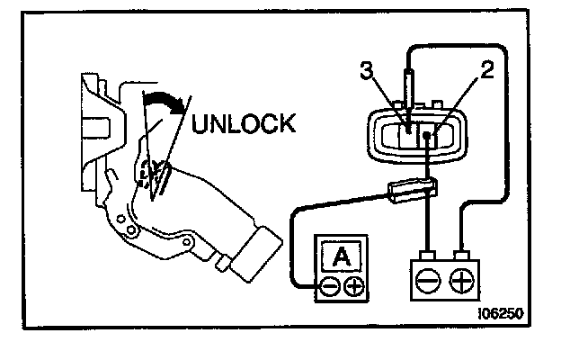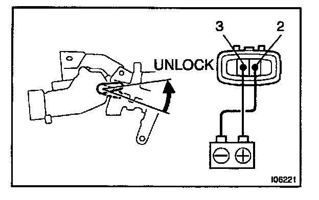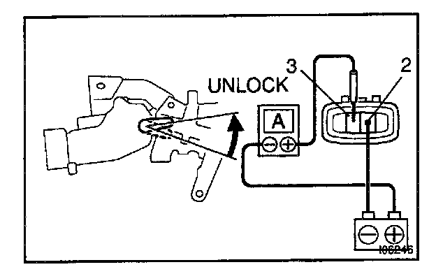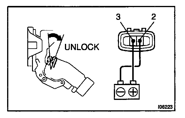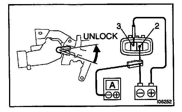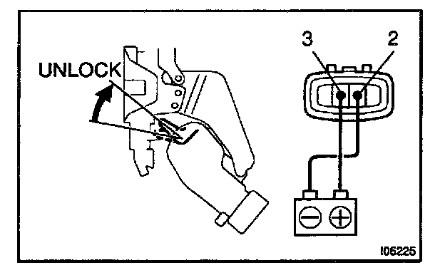 a. Connect the positive (+) lead from the battery to terminal 3 and the negative (-) lead to terminal 2, and check that the door lock link moves to UNLOCK position.