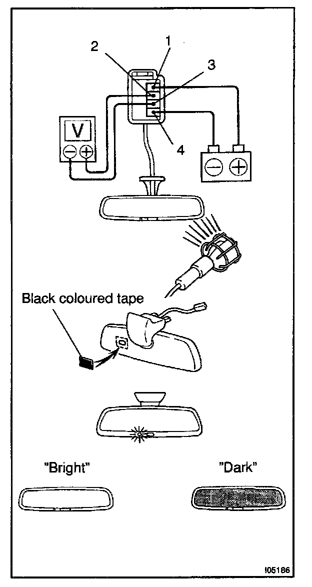 e. Light up the mirror with an electric light, and check that there is battery positive voltage and mirror surface changes "bright" to "dark".